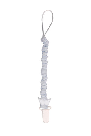 Blue dummy clip from Portuguese brand Baby Gi, the dummy clip features a white set of silver trimmed angel wings. Comes in a blue voile ribbon trimmed pouch.