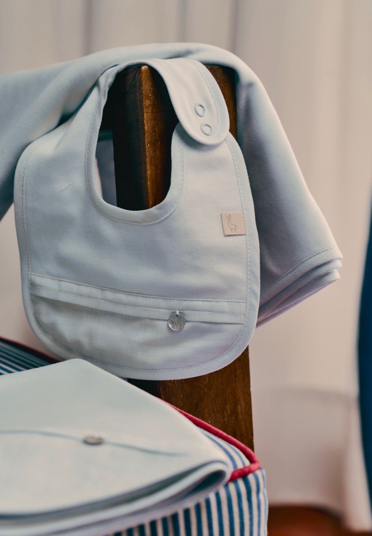 Soft blue cotton bib trimmed to the lower part of the bib with a lightweight blue and white shirt checked fabric and a classic Baby Gi mother-of-pearl charm. Bib popper fastens to the side.