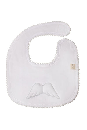 White cotton bib from Portuguese brand Baby Gi, the bib features an embroidered set of white angel wings to the front trimmed in silver stitching. Bib velcro fastens to the side.
