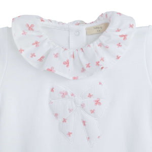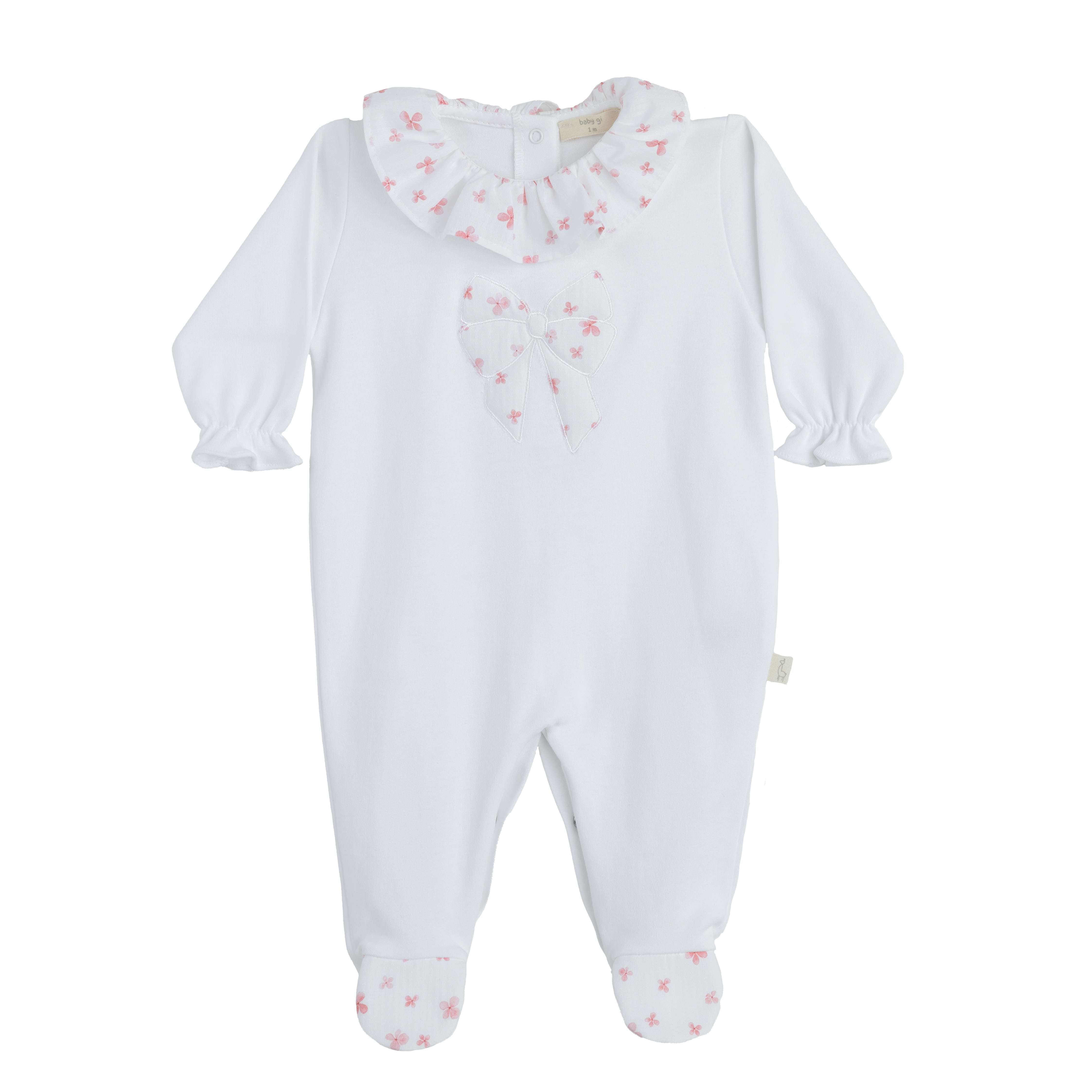 Pretty babygrow from Portuguese brand Baby Gi. Made from a soft white pima cotton the babygrow features a white and pink blossom print applique bow motif to the front with matching ruffle collar and feet. Popper fastens at the back and between the legs. Matching bib and blanket available to buy separately. Fit: True to size (e.g. 3 months = 0-3)Composition: 100% Pima CottonCare: Machine Washable (40 degrees) Brand: Baby Gi