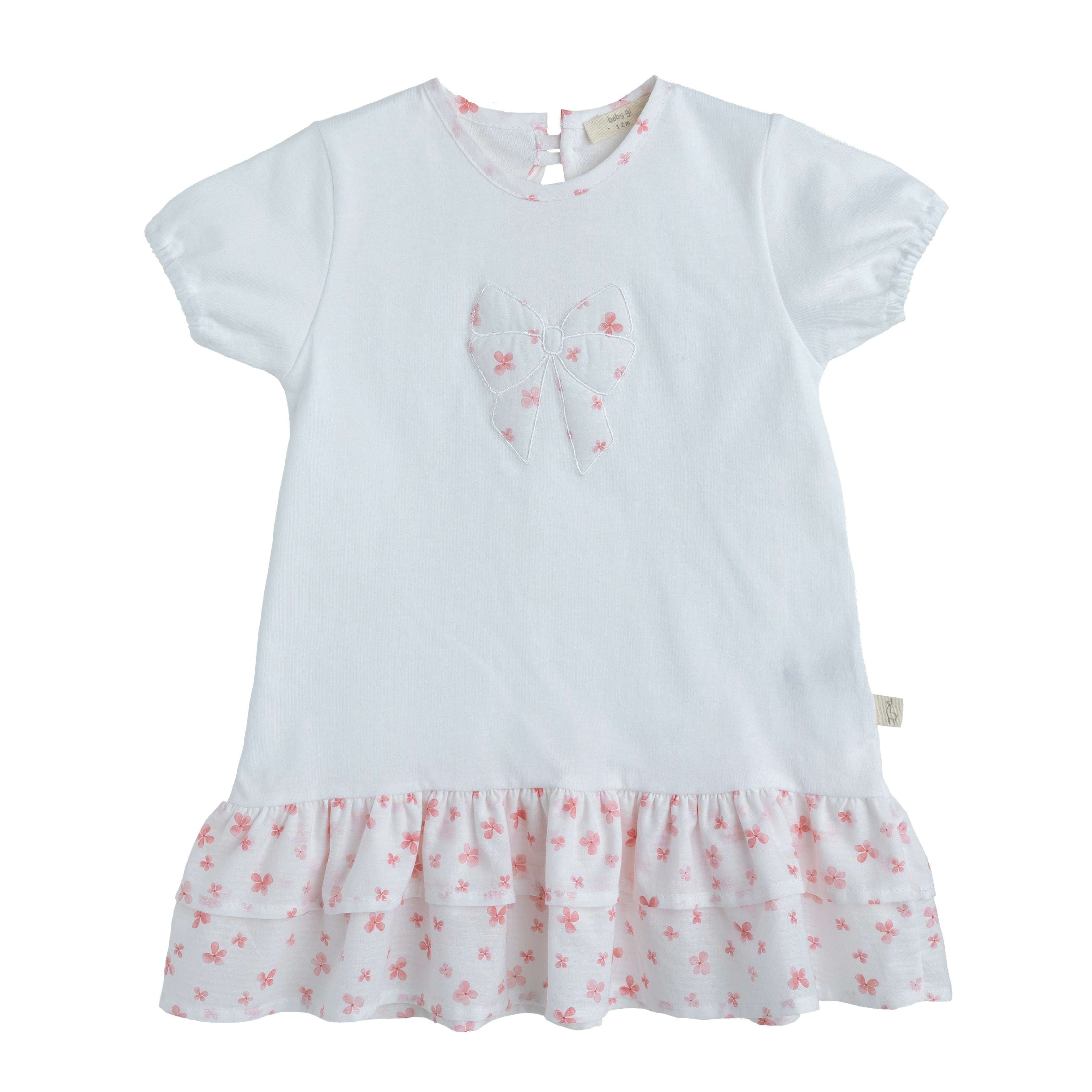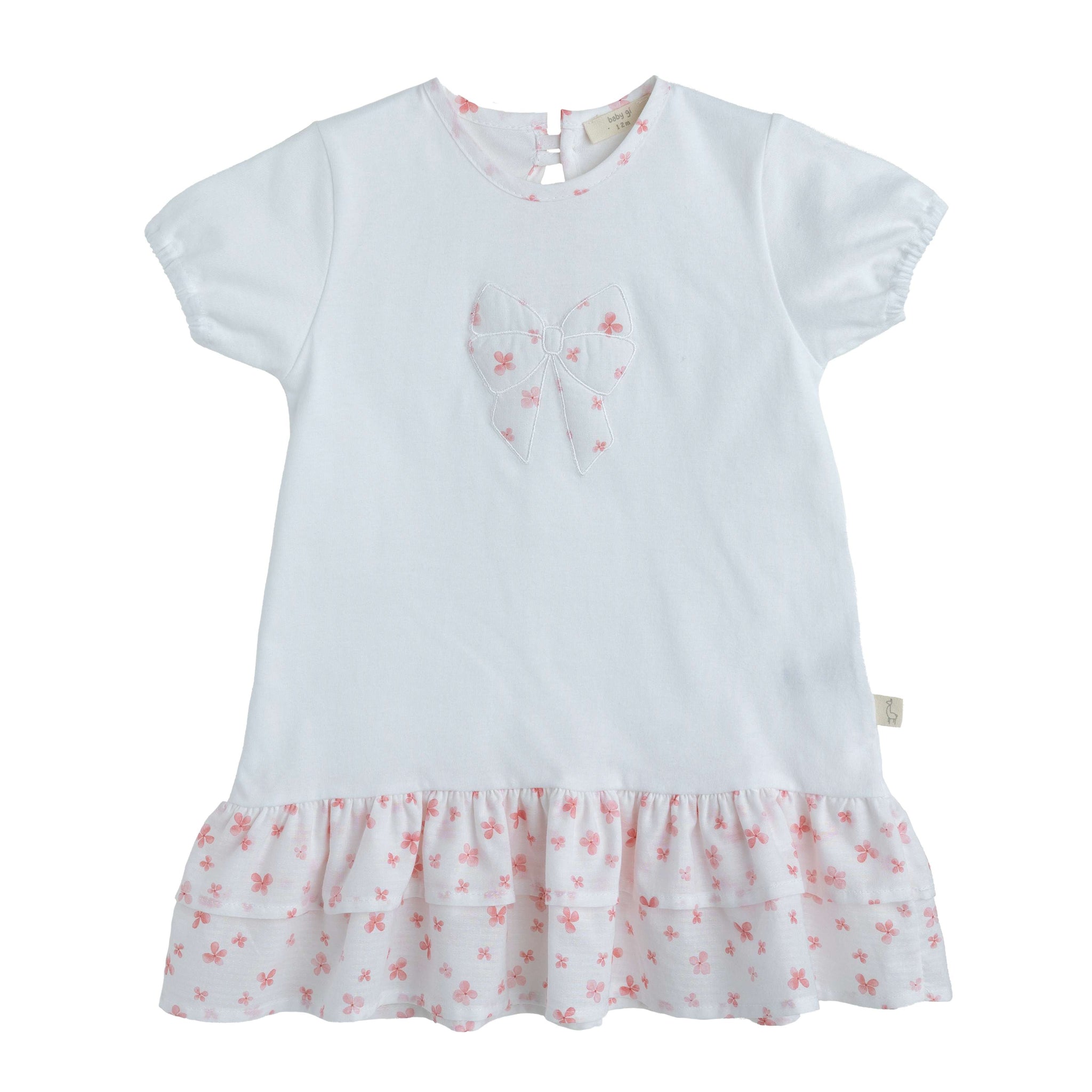 Gorgeous dress from Portuguese brand Baby Gi. Made from a soft white pima cotton the dress has a drop waist with a double frill skirt in a white and pink petal print, the same print is used for the applique bow to the chest and the trim to the neckline. Fit: True to size (e.g. 3 months = 0-3) Composition: 100% Pima CottonCare: Machine Washable (40 degrees) Brand: Baby Gi