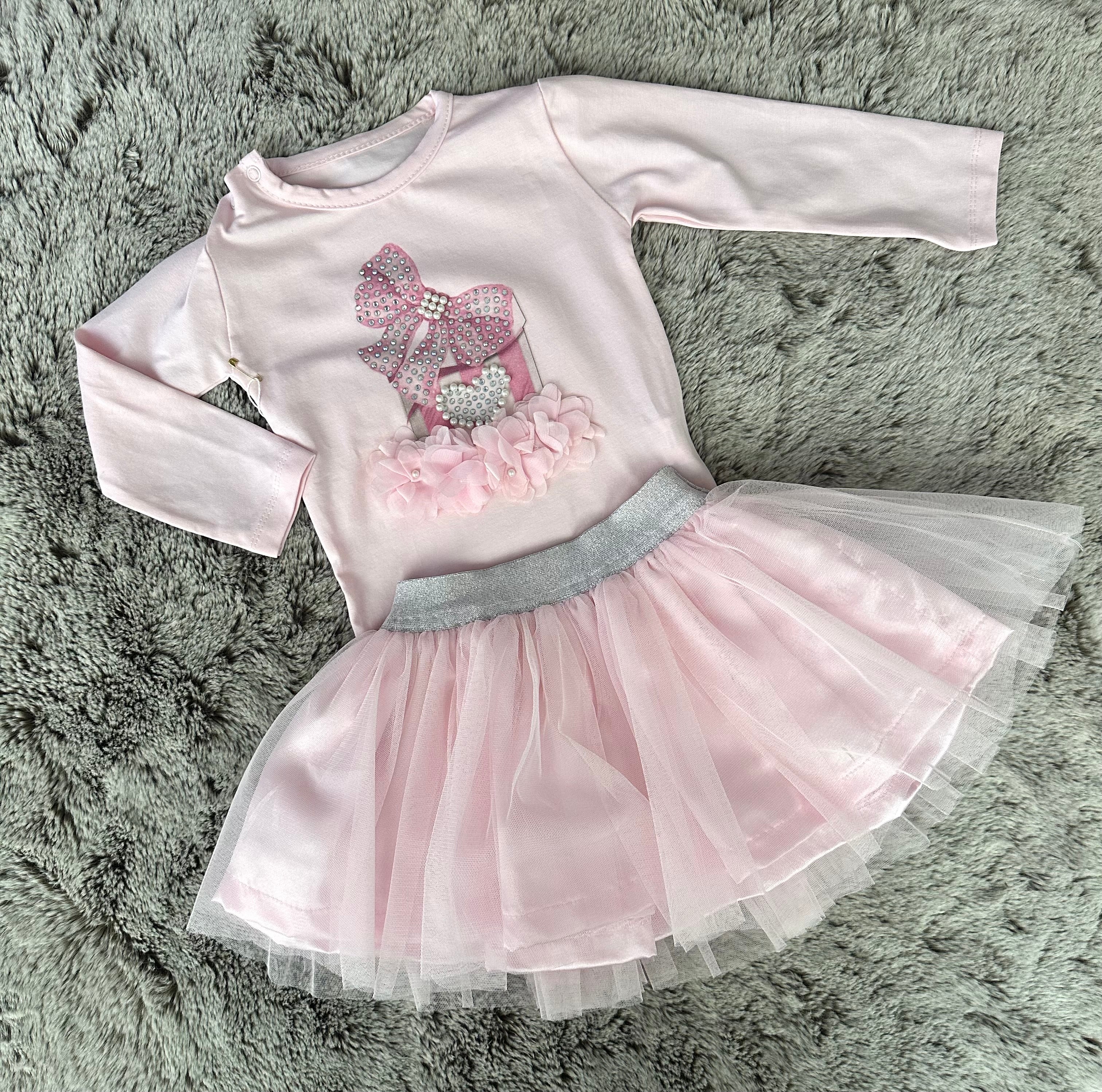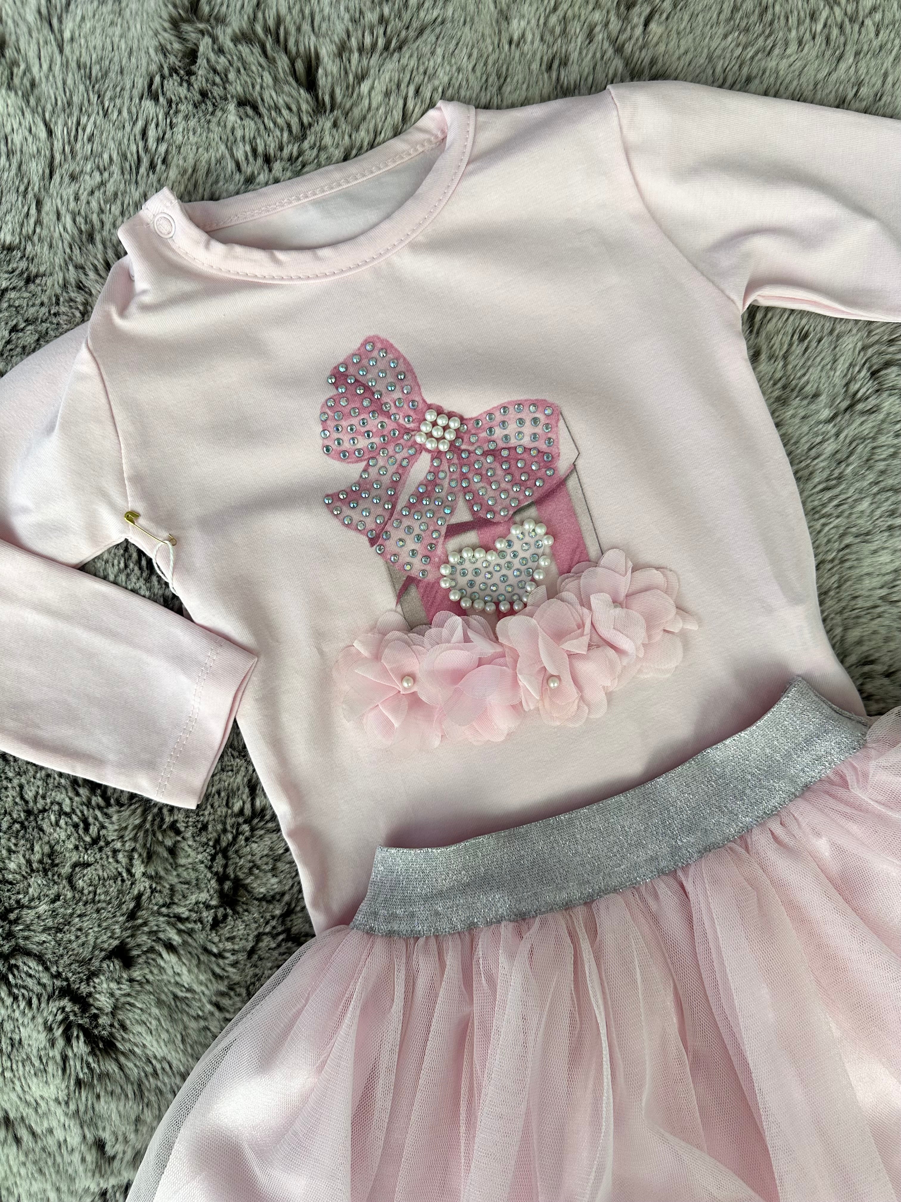 Gorgeous skirt set for baby girl, the soft feel pink cotton body features a diamonte and pearl trimmed gift box decorated with pretty tulle flowers, comes a multi-layered pink tulle skirt with a pink satin underskirt and a white lining, a silver elasticated waistband completes the look.