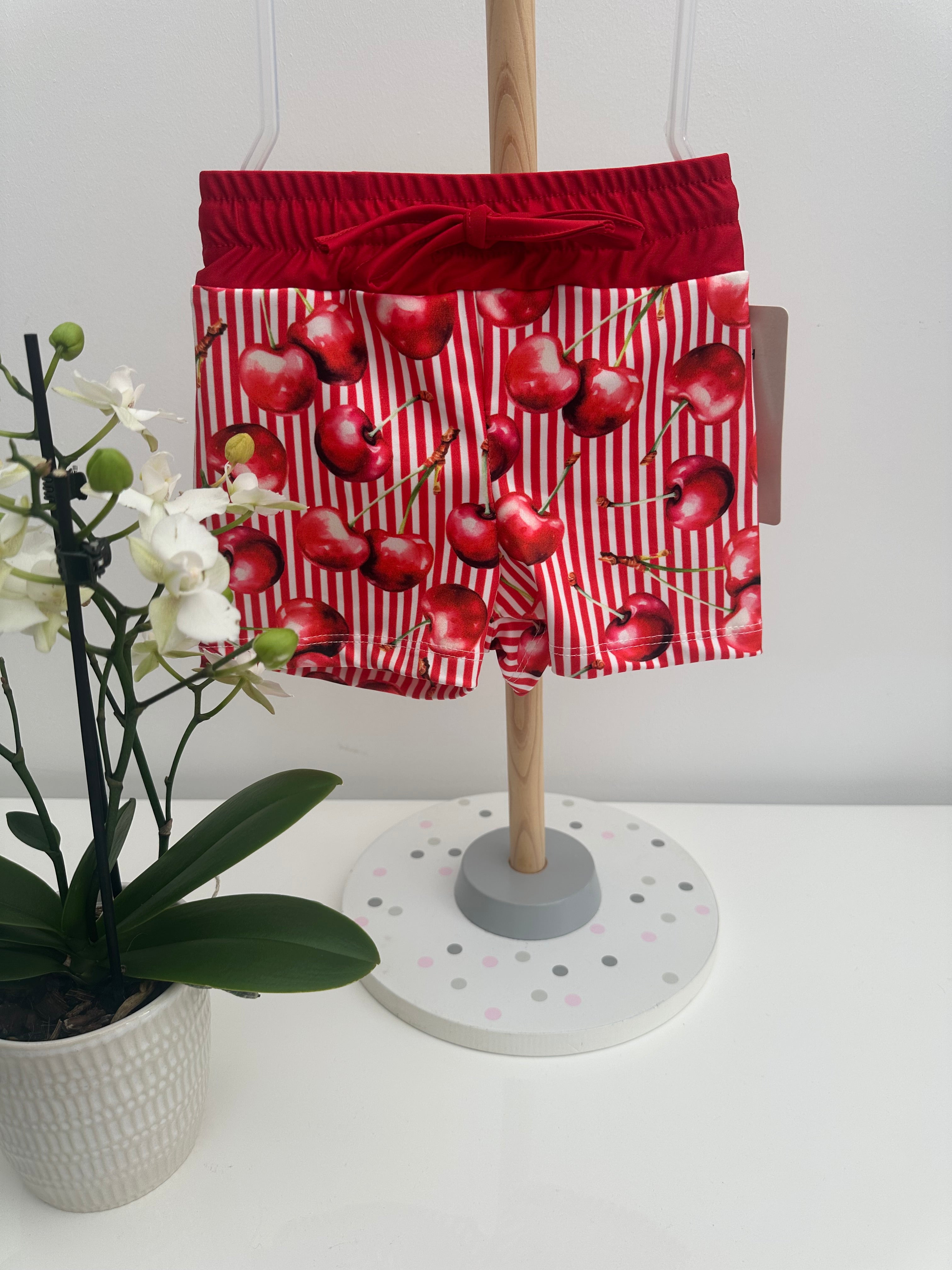 The swim shorts are a deep red and white stripe overlaid with a large cherry print and feature a deep red elasticated waistband with a drawstring. These are a close fit swim trunk not a baggy style swim short. Fit: True to size (e.g. 12 months = 9-12 months)Composition: 95% polyester, 5% elastane Care: Machine Washable (30 degrees) Made in Italy