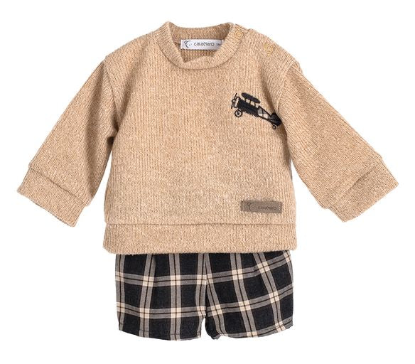 AlSweet set for boys from Spanish brand Calamaro. The soft feel camel knitted top popper fastens at the shoulders and features a vintage aircraft applique motif in a brown, camel and slate grey check cotton to match the shorts. The jam pants have an elasticated waistband to the back.