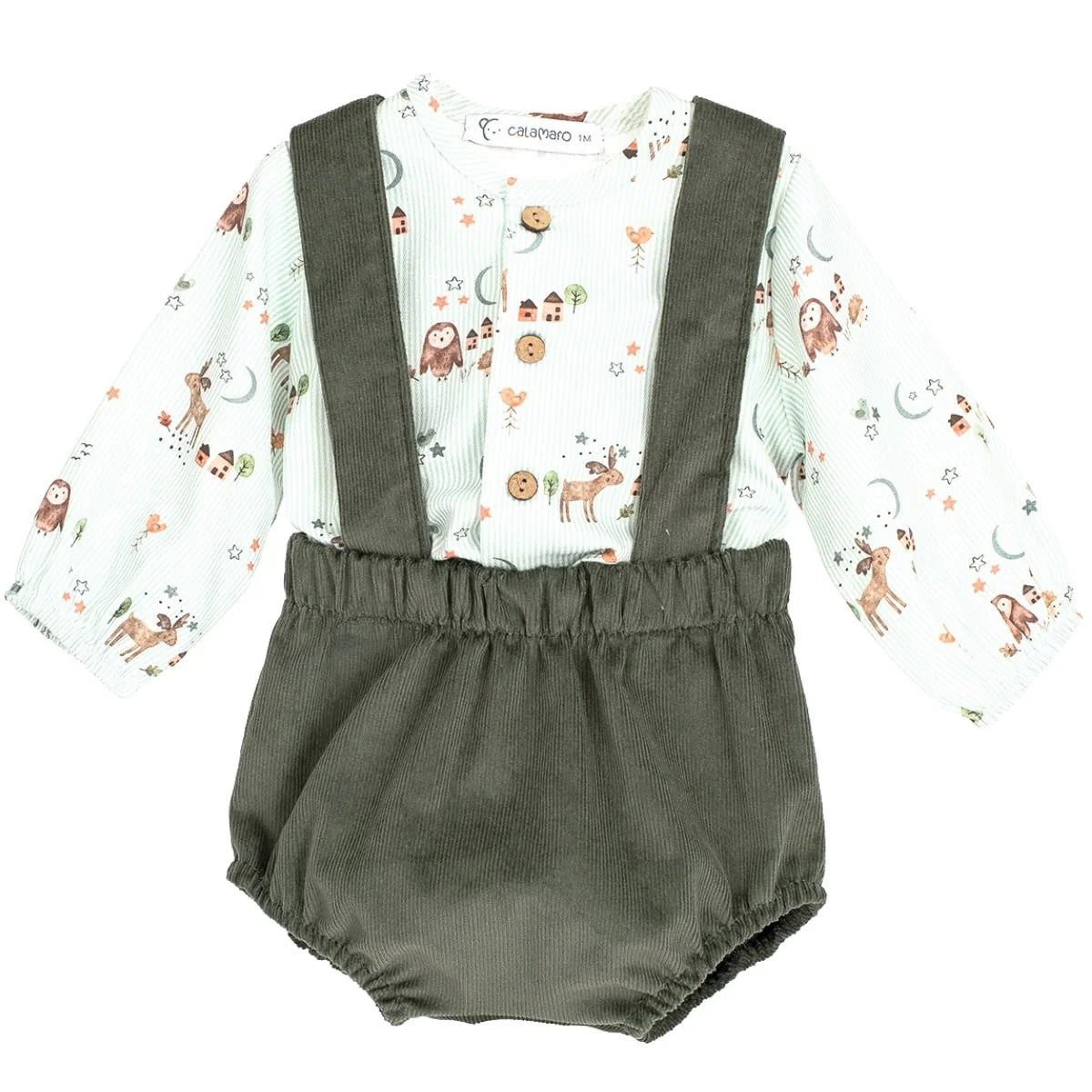 Al Smart set for baby boys from Spanish brand Calamaro. The soft feel collarless shirt is a white and green striped cotton fabric overlaid with a woodland print to match the braced jam pants are a dark green corduroy with an elasticated waistband and leg cuffs, the braces button fasten at the front with wood effect buttons, the same button fastenings are used for the shirt.