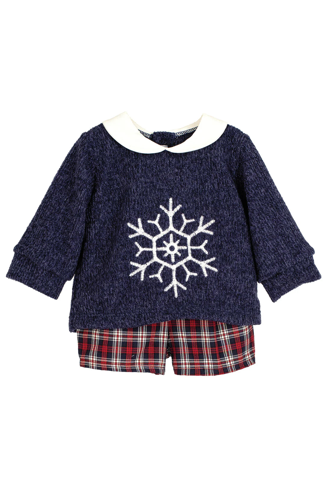 Calamaro Navy Chenile Snowflake Sweater & Tartan Shorts Set