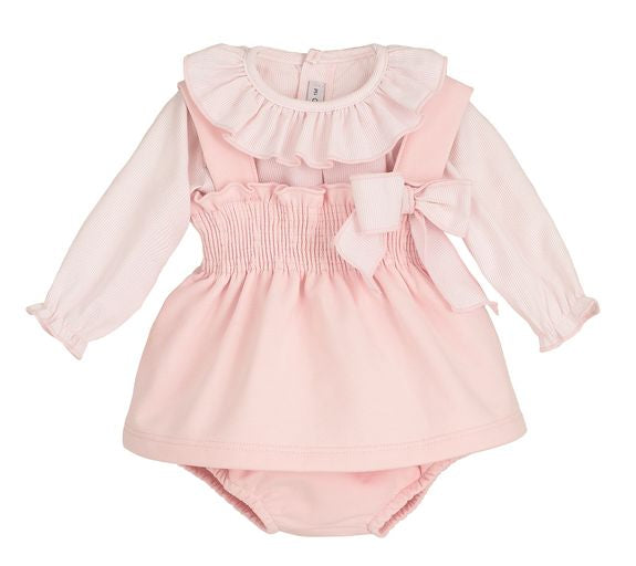 Pretty set for girls from Spanish brand Calamaro. The pinafore is made from a soft feel cotton pink fleece, a sweet shirred bodice is trimmed with a pink and white pinstriped bow that matches the blouse, the blouse features a lovely ruffle collar. Blouse button fastens at the back, the set comes with matching pink fleece pants.