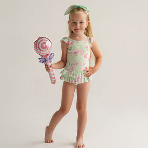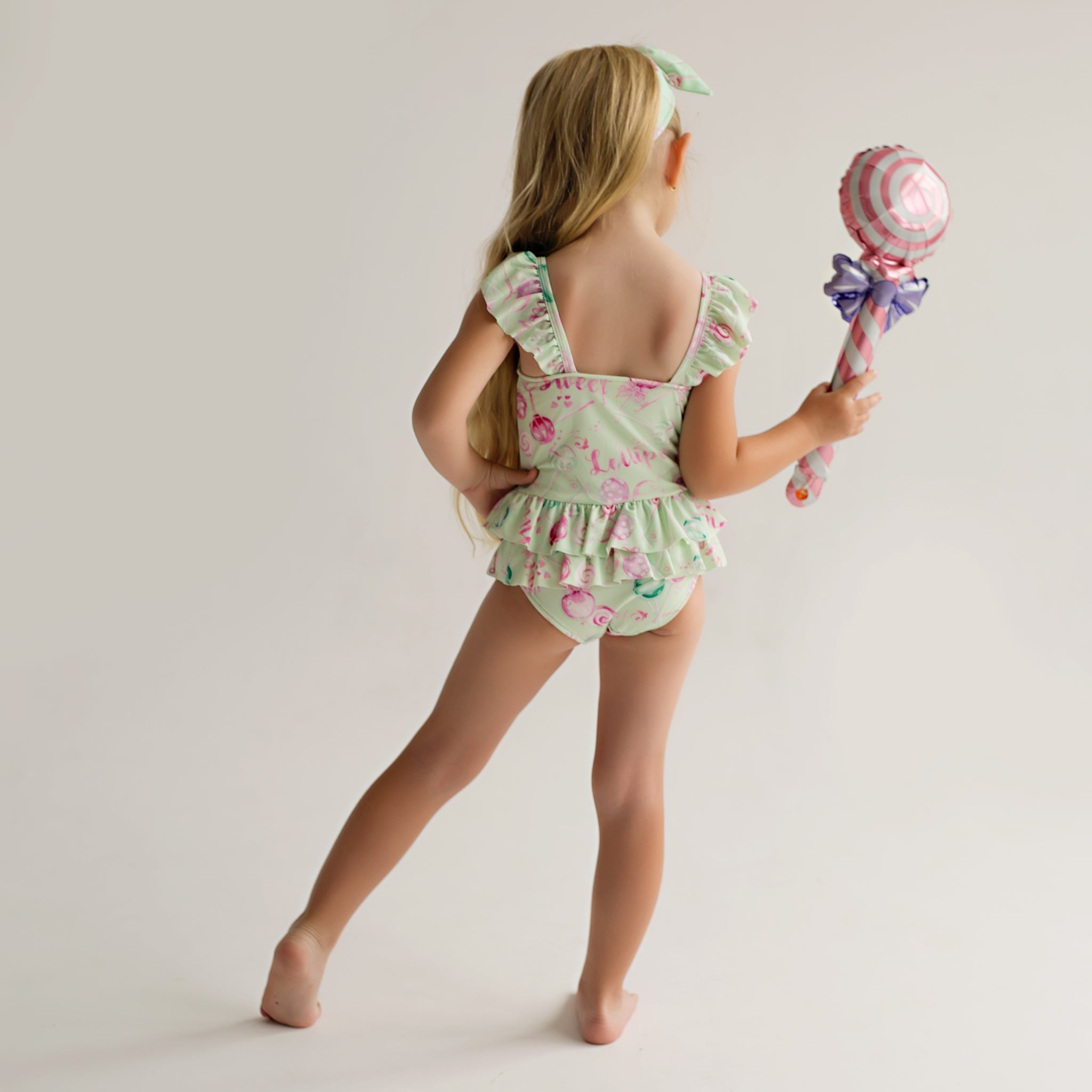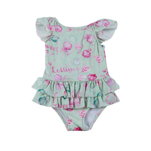 Gorgeous swimsuit from Polish brand Daga. The swimsuit is a mint green and pink lollipop print, pretty flutter sleeves to the front and back and a double frill to the lower half complete the look to this adorable swimsuit. Swimsuit is lined in a soft white fabric for comfort.
