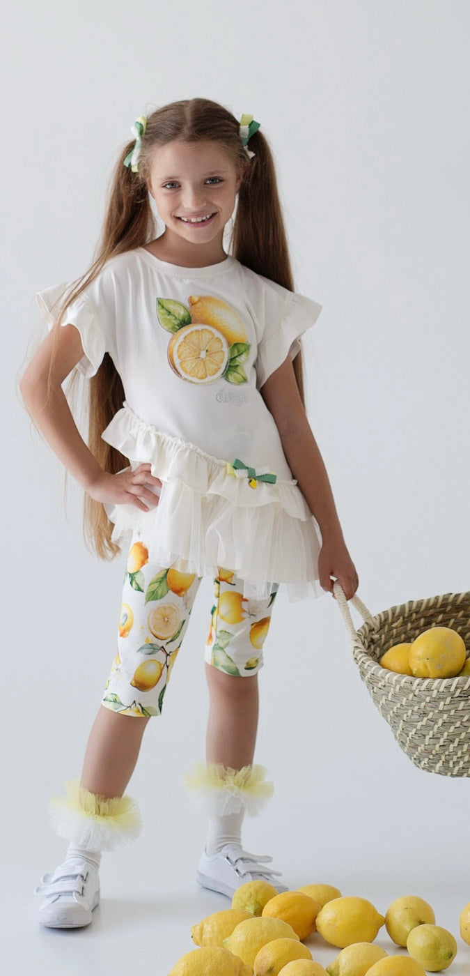 Stunning summer legging set from Polish brand Daga. The white cotton tunic top has a large lemon print motif to the front, sweet flutter sleeves and a diagonal feature double layered tulle frill trimmed with a green and lemon grosgrain bow. The white knee length leggings feature a large lemon print all over. Fit: True to size (e.g. 12 months = 9-12 months)Composition: 100% cotton Care: Machine Washable (30 degrees) Brand: Daga
