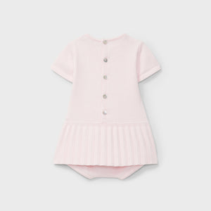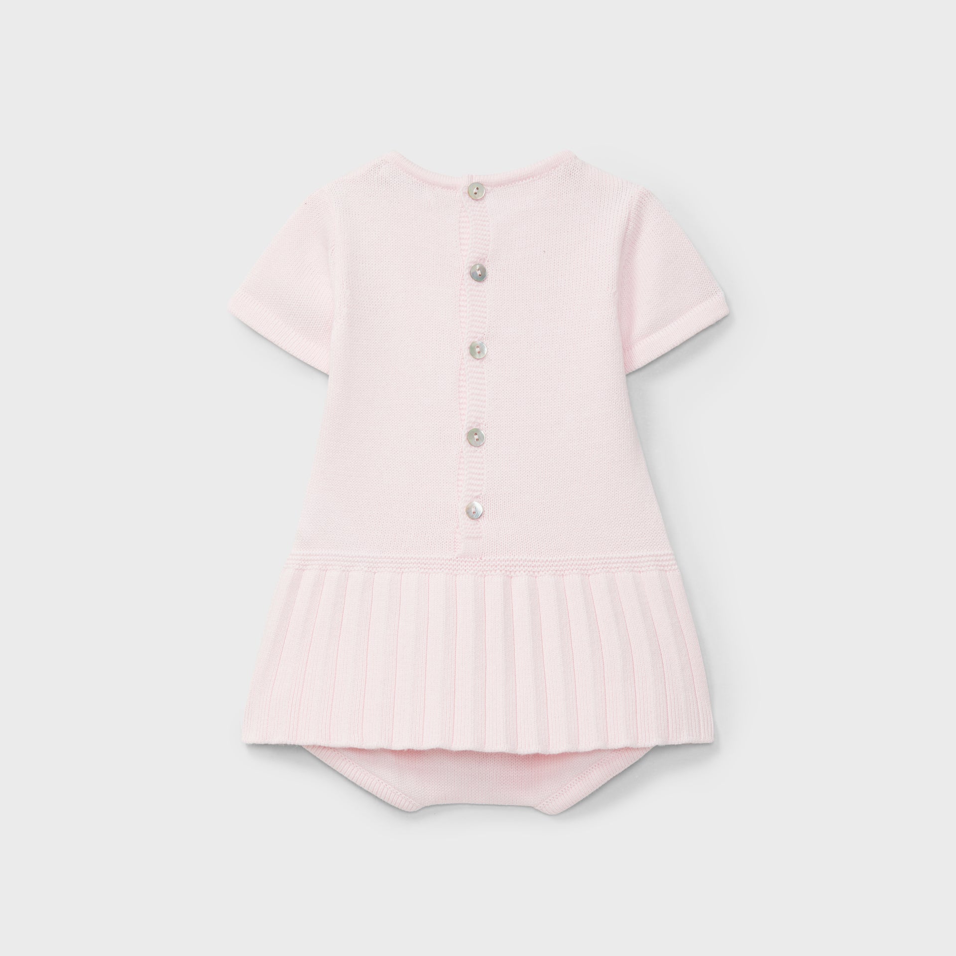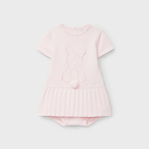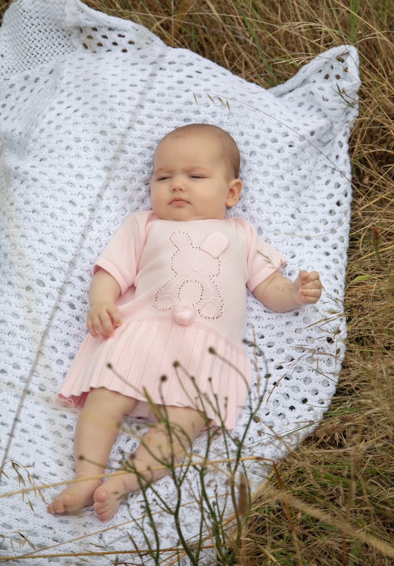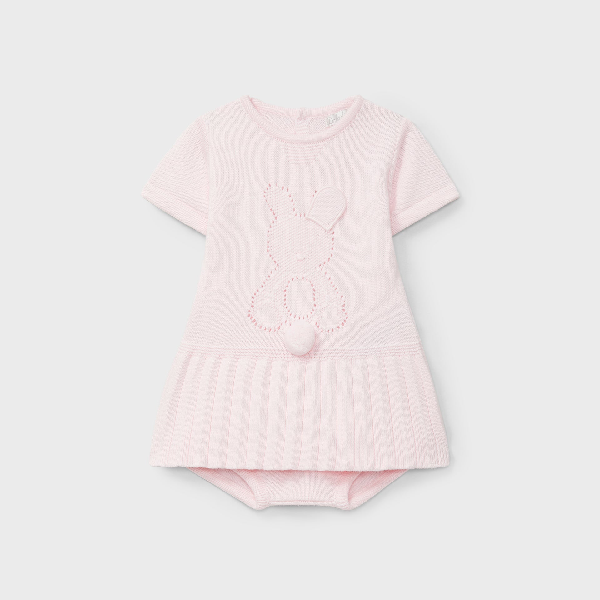 Adorable dress for baby girls from Portuguese brand Dr. Kid. Made from a soft pink knitted organic cotton the dress features a cute embroidered bunny to the front complete with sweet pompom tail. The dress has a pleated skirt and comes with matching pink knitted pants. Button fastens at the back. Fit: True to size (e.g. 12 months = 9-12 months)Composition: 100% organic cotton knit Care: Machine Washable (30 degrees) Brand: Dr Kid