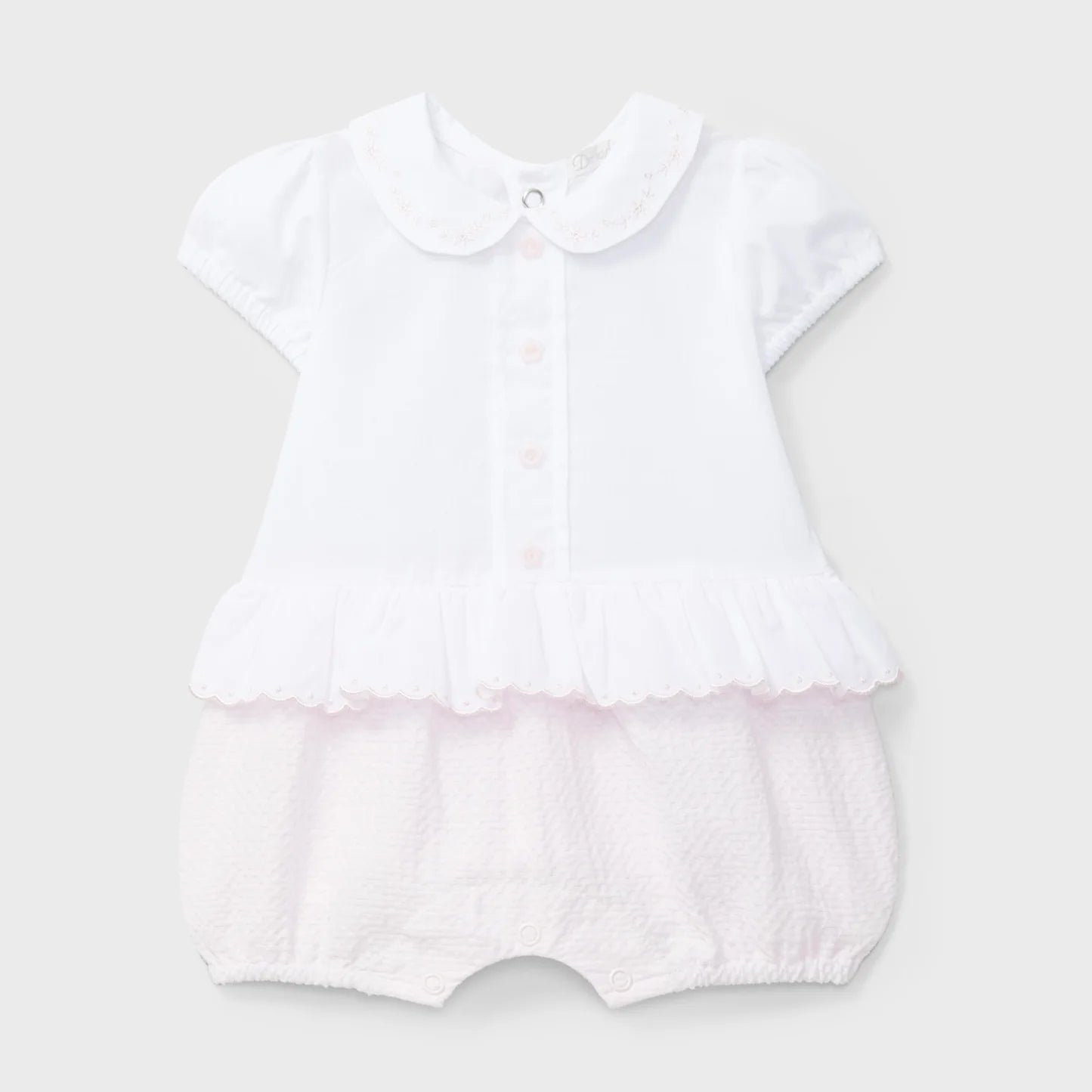 Stunning summer romper from Portuguese brand Dr. Kid. The top half of the romper is a soft white cotton, a panel to the front trimmed with pink flower shaped buttons, a collar embroidered with a garland of pink flowers and a frill to the waistband add beautiful detailing, the lower half is a pink textured cotton. Popper fastens between the legs and at the back.
