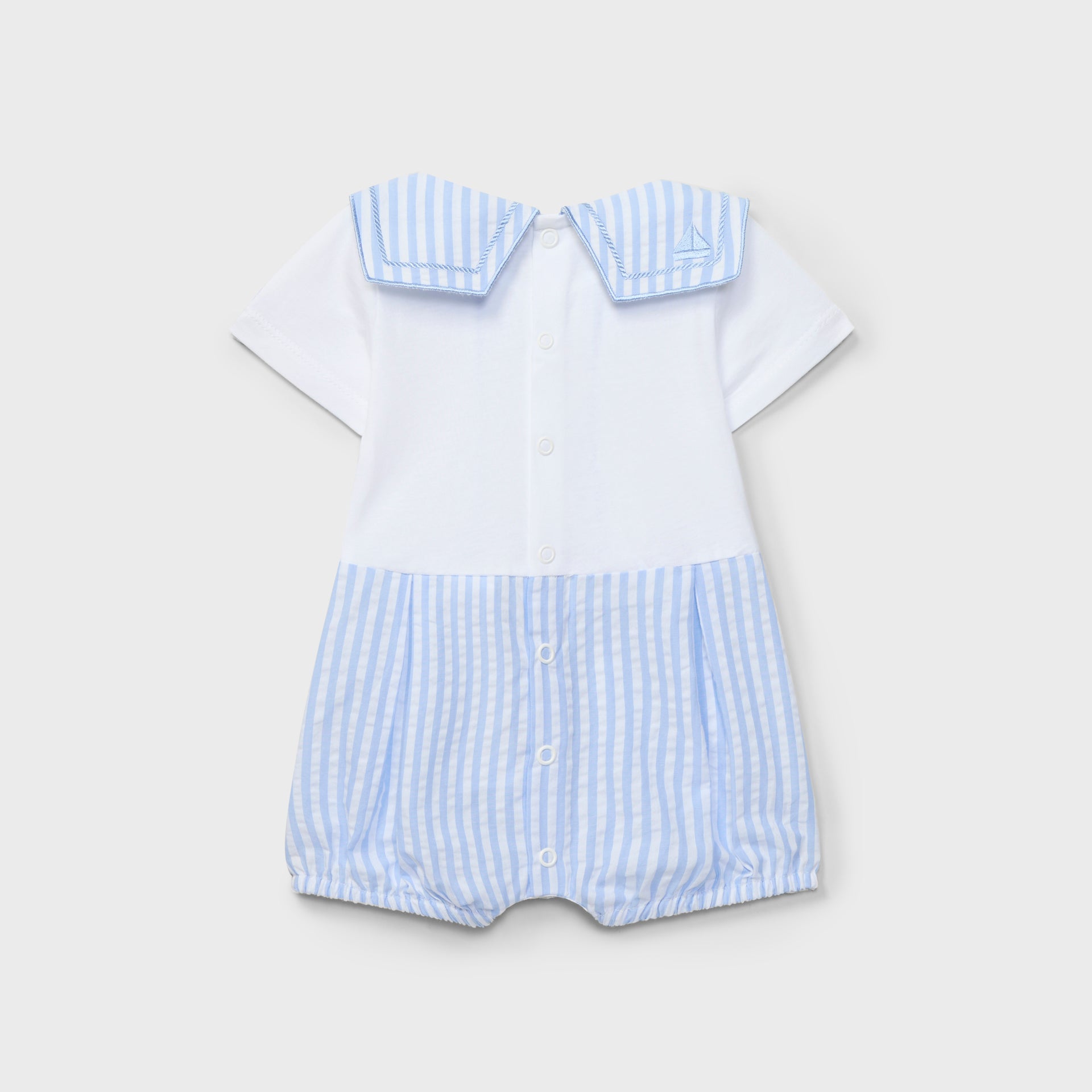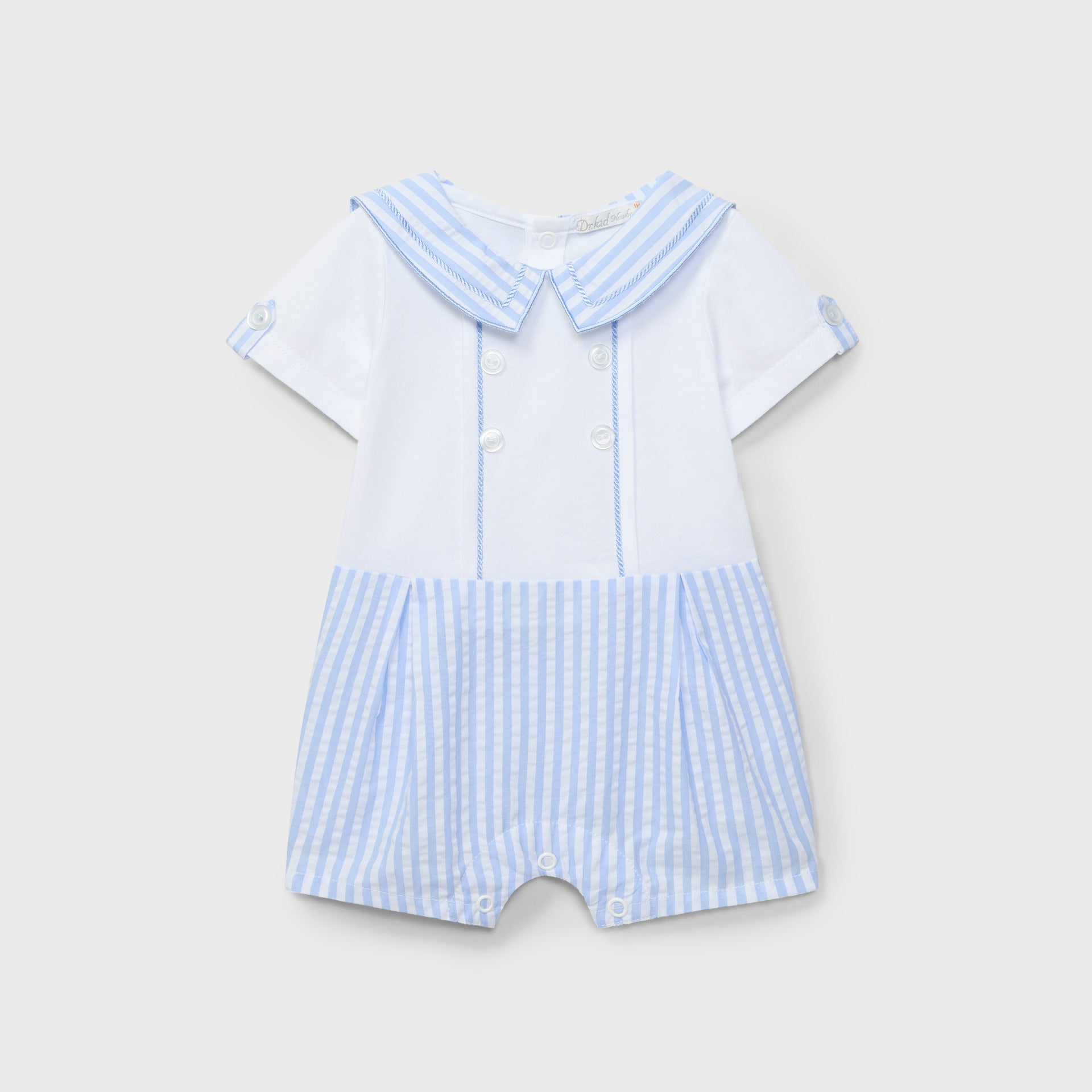Smart romper for boys from Portuguese brand Dr. Kid. The upper half is a soft white jersey cotton, a cute front panel embroidered with a sky blue rope trim, faux buttons add sweet detailing. The lower half and collar are a sky blue and white cotton seersucker stripe rope embroidery to the collar completes the look. Popper fastens to the back and between the legs. Fit: True to size (e.g. 12 months = 9-12 months)Composition: 100% cotton Care: Machine Washable (30 degrees) Brand: Dr Kid