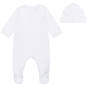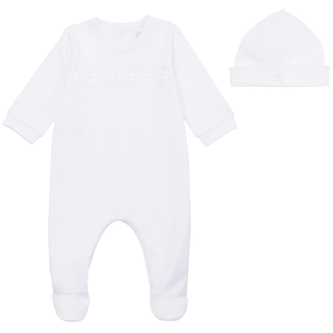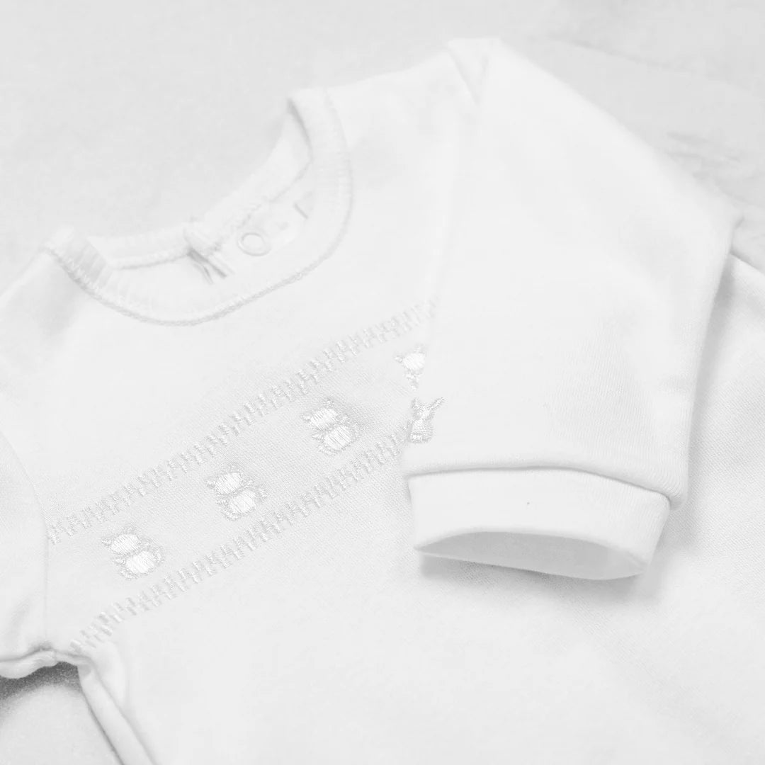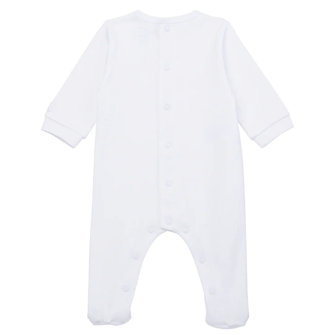 Classis style babygrow from British brand Emile et Rose. Made from a soft feel white cotton the babygrow features a white collar and feet, white pearlised buttons to the front and a front panel embroidered with bears. Comes with a matching hat with sweet bunny and bear embroidery to the front. Popper fastens at the front and between the legs. Fit: True to size (e.g. 12 months = 9-12 months)Composition: 100% soft cotton Care: Machine Washable (40 degrees) Brand: Emile et Rose