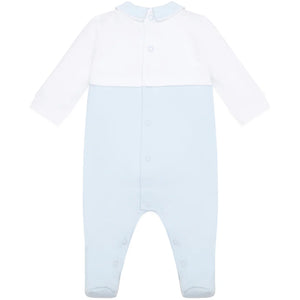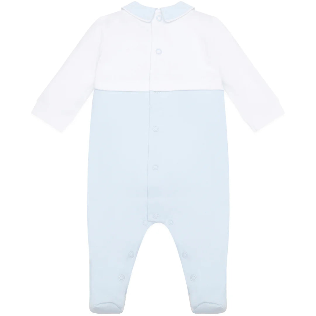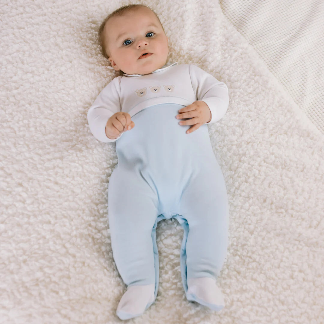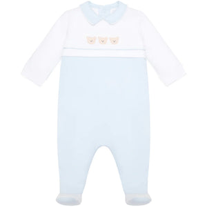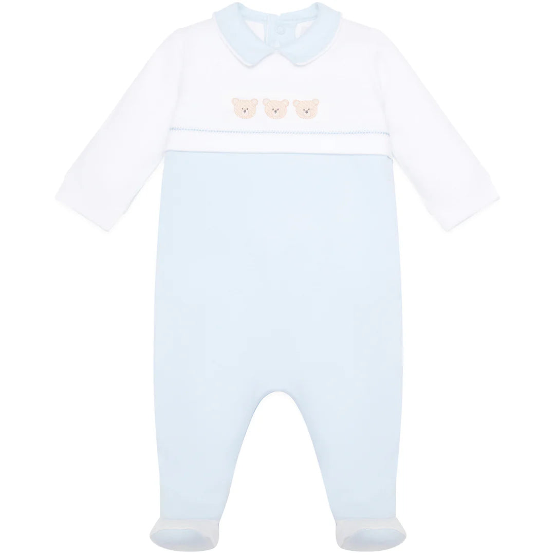 Adorable babygrow from British brand Emile etRose. Made in a soft feel cotton the white top half features three sweet embroidered teddy bear faces, a blue collar to match the lower half and white feet complete the look. Comes with a matching blue hat. Popper fastens at the back and between the legs Fit: True to size (e.g. 12 months = 9-12 months)Composition: 100% soft cotton Care: Machine Washable (40 degrees) Brand: Emile et Rose
