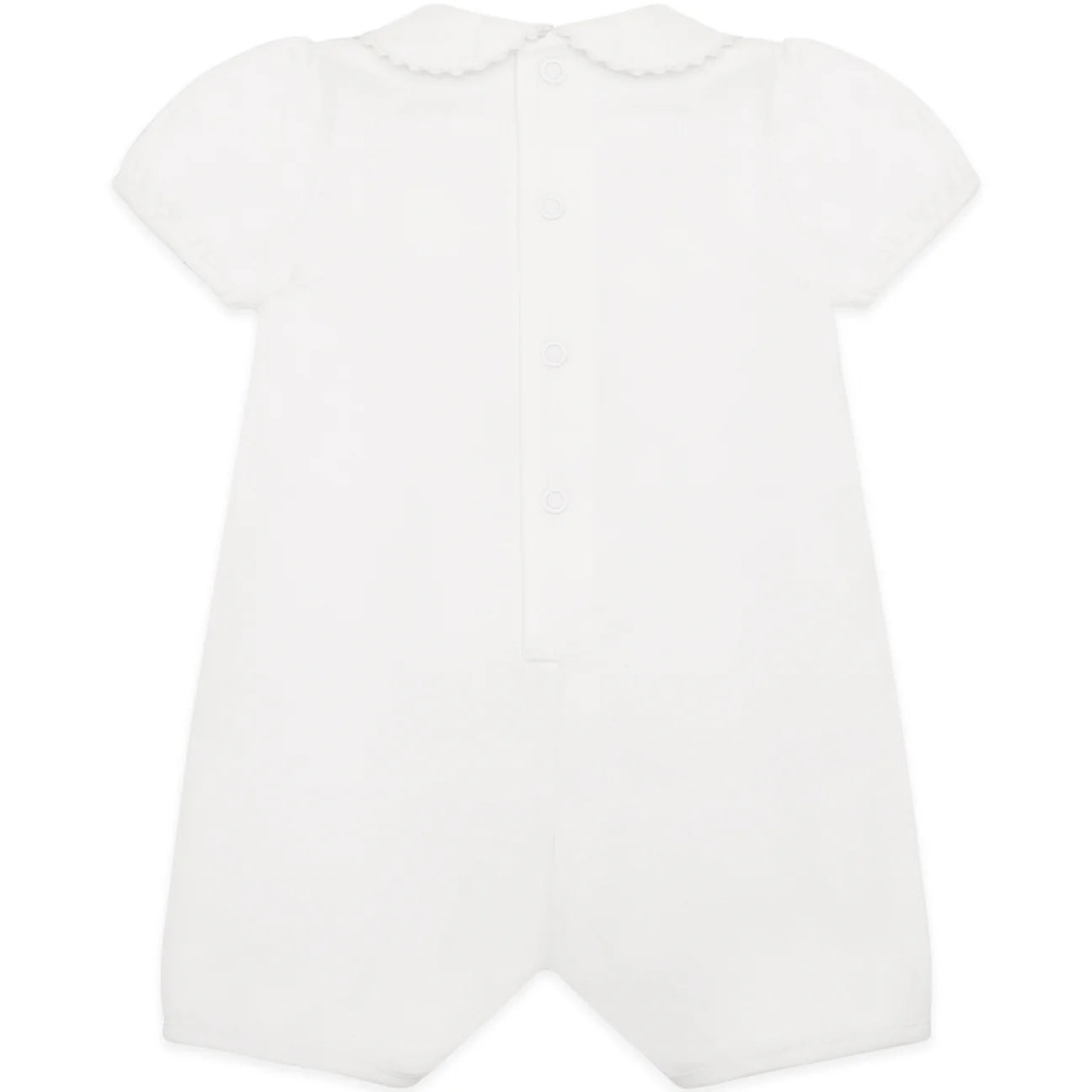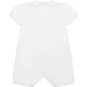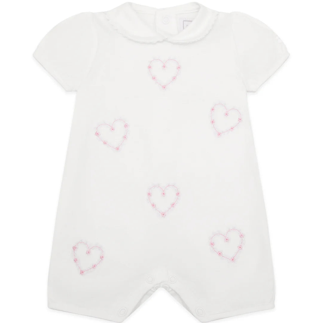 Beautiful romper for baby girls from British brand Emile et Rose. The soft feel white jersey romper features pink embroidered hearts all over and a sweet rounded collar with a white ric-racedge. Popper fastens at the back and between the legs. Fit: True to size (e.g. 12 months = 9-12 months)Composition: 100% soft cotton Care: Machine Washable (40 degrees) Brand: Emile et Rose
