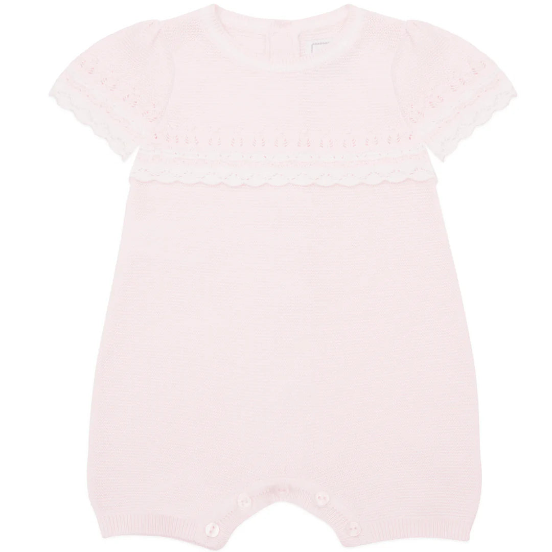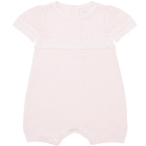 Stunning knitted romper from British brand Emile et Rose. Made from a soft feel cotton knit the romper features beautiful intricate white detailing and pretty cut work to the bodice and sleeves. Romper fastens with pearlised buttons at the back and between the legs. Fit: True to size (e.g. 12 months = 9-12 months)Composition: 100% soft cotton knitCare: Machine Washable (40 degrees) Brand: Emile et Rose