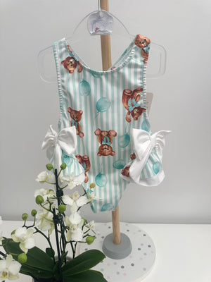 The swimsuit is a mint green and white stripe overlaid with a teddy bear print. Crossover straps to the back, white and teddy bear print frills to the side and two large white bows to the front complete the look. Fit: True to size (e.g. 12 months = 9-12 months)Composition: 95% polyester, 5% elastane Care: Machine Washable (30 degrees) Made in Italy