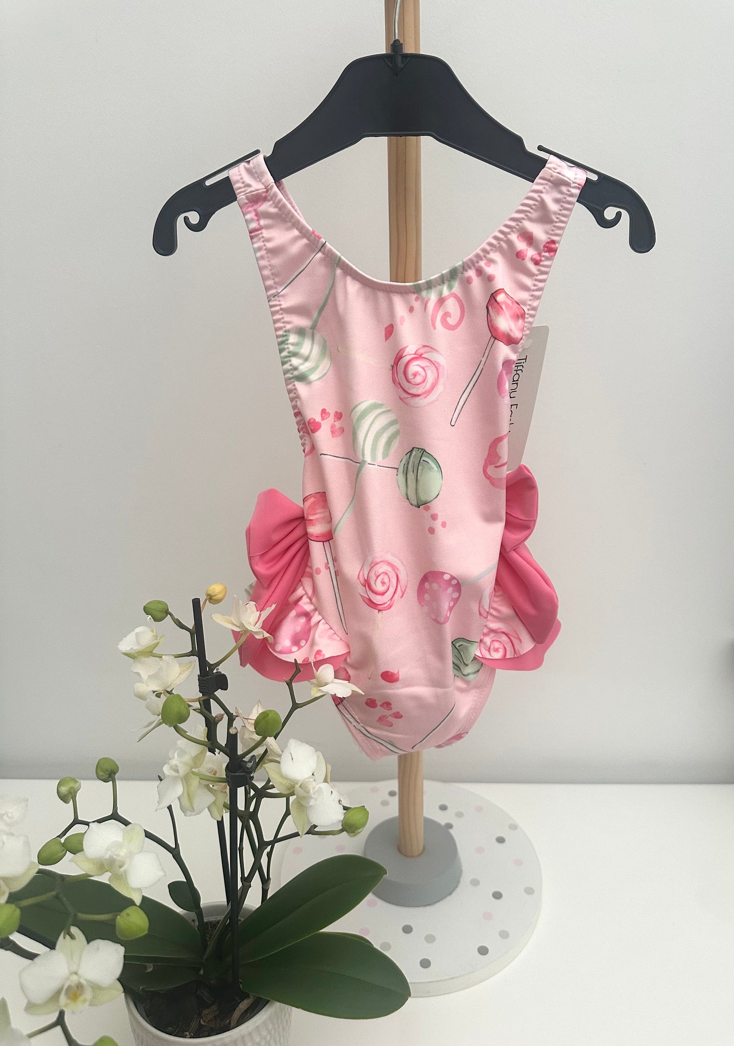 Pretty swimsuit for girls, a pale pink the swimsuit features a white and green lollipop print all over. Crossover straps to the back, deep pink and lollipop print frills to the side and two large deep pink bows to the sides complete the look.
