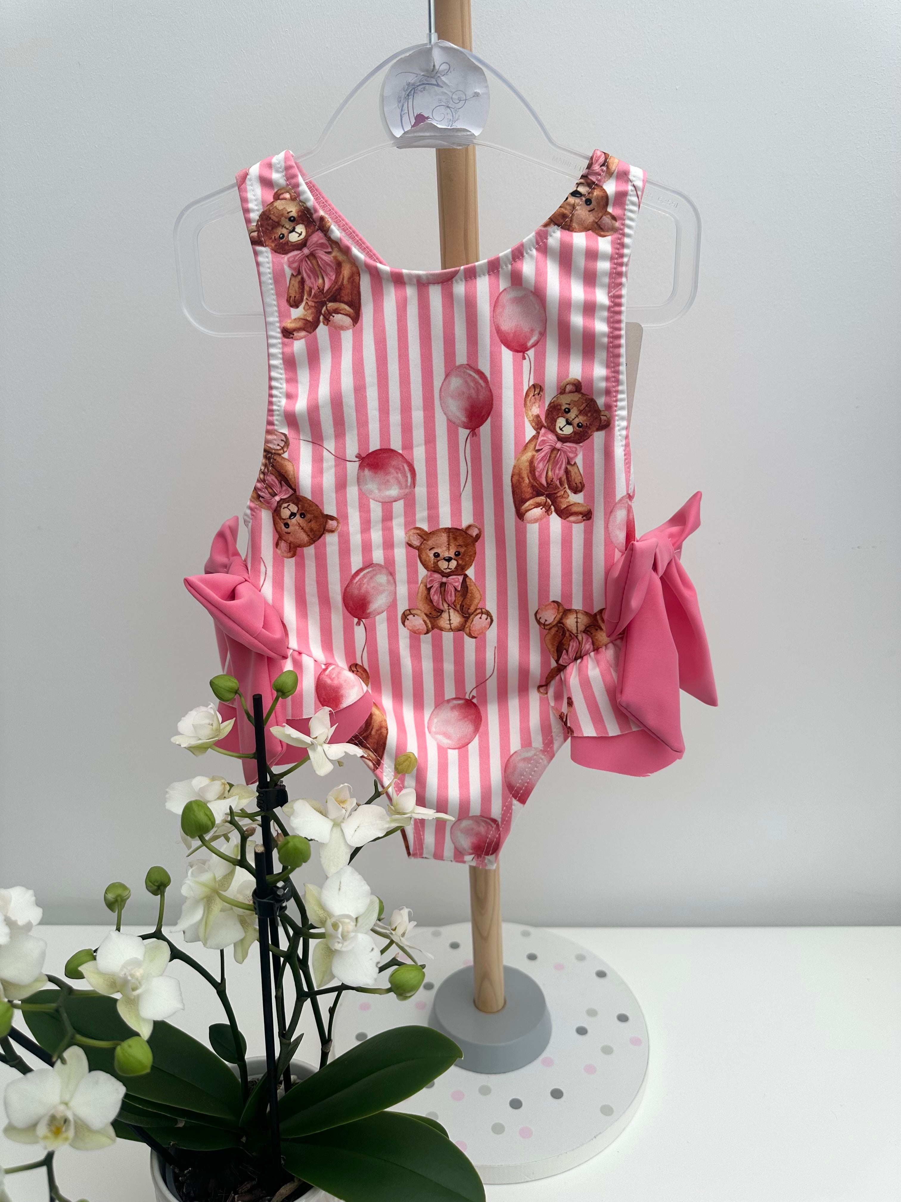 The swimsuit is a pink and white stripe overlaid with a teddy bear print. Crossover straps to the back, pink and teddy bear print frills to the side and two large pink bows to the front complete the look. Fit: True to size (e.g. 12 months = 9-12 months)Composition: 95% polyester, 5% elastane Care: Machine Washable (30 degrees) Made in Italy