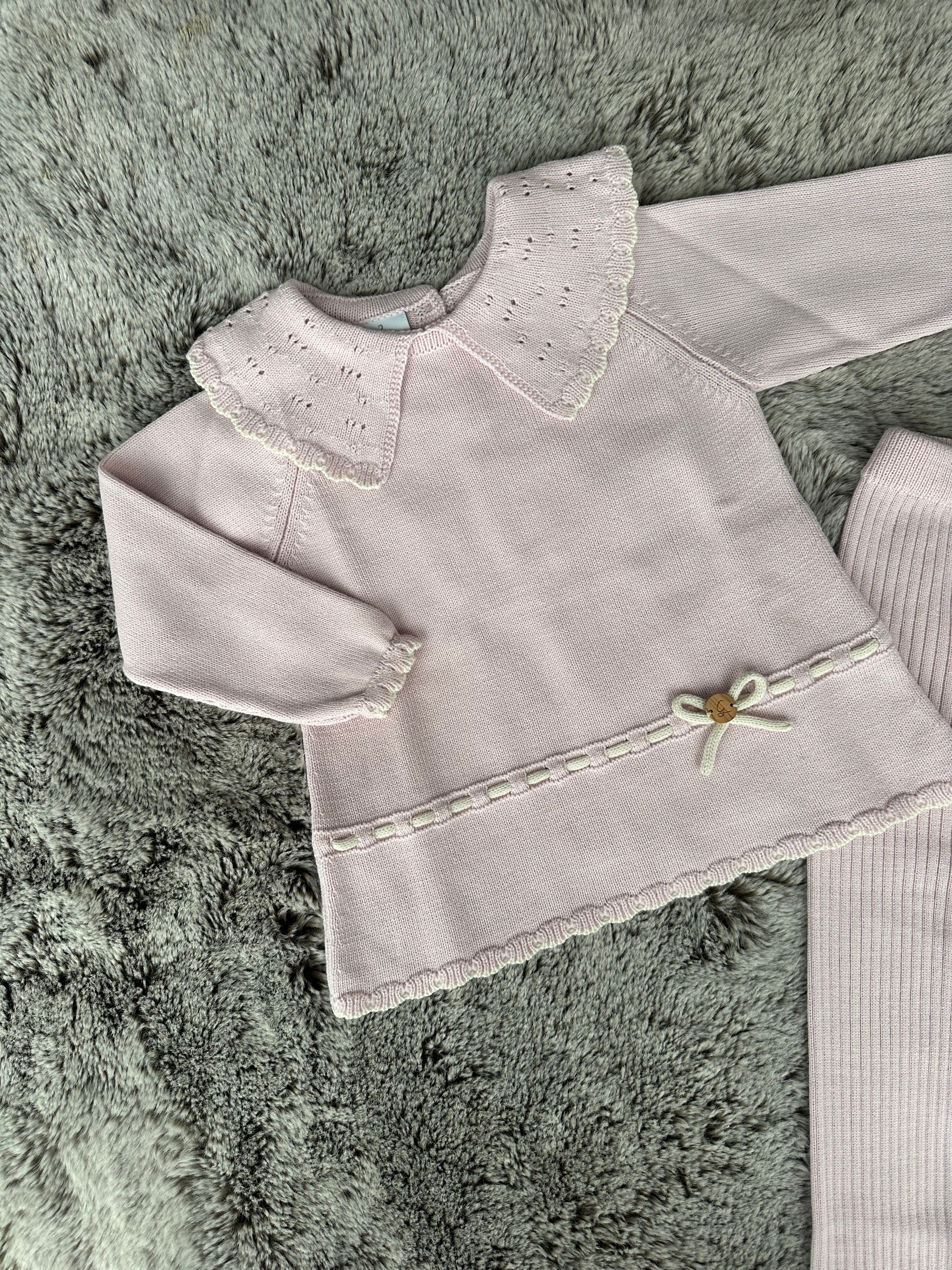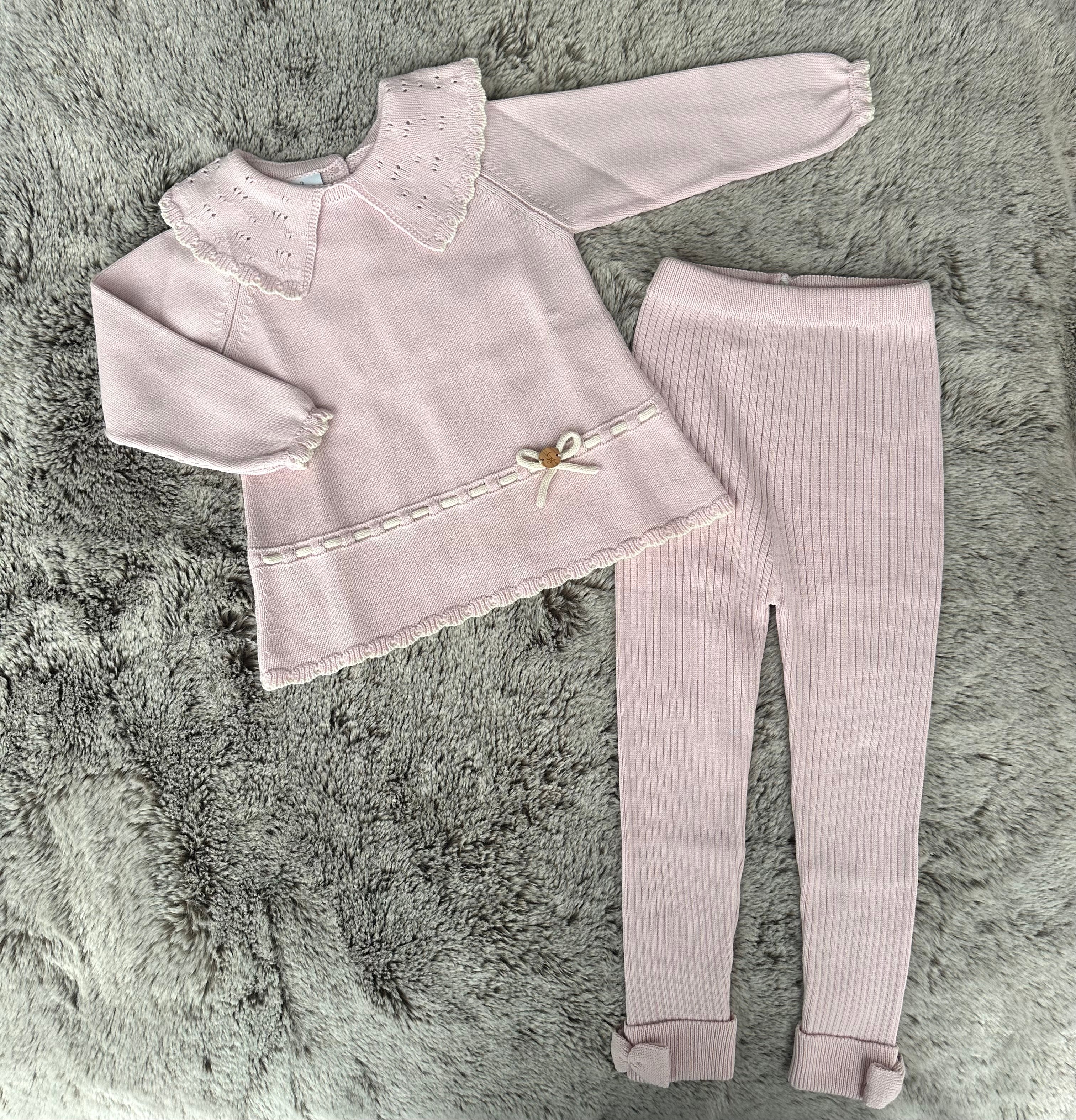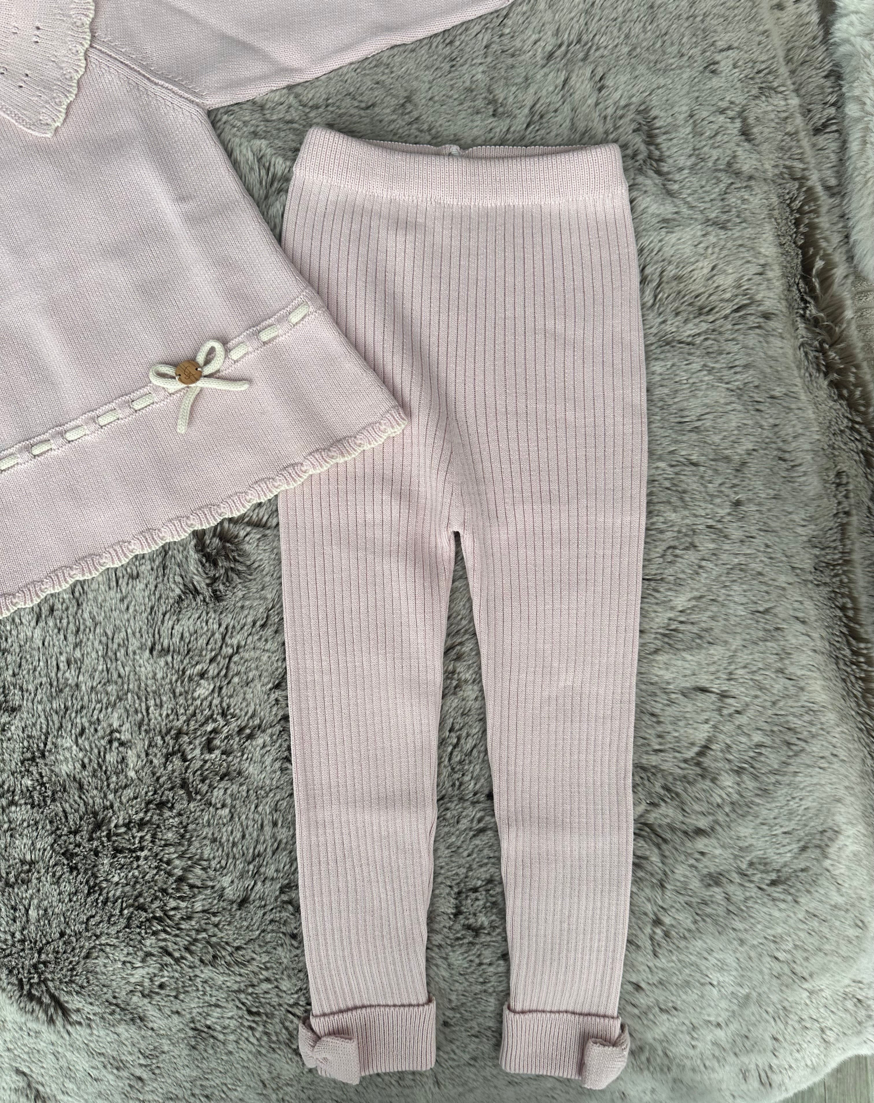 Beautiful set for girls from Spanish brand ArtesaniaGranlei. Made from a soft feel fine acylic knit, the top features a stunning cutwork collar trimmed in ivory, ivory trimmed scalloping to the cuffs and hem and an ivory knitted threaded woven bow trimmed with a wooden Granlei charm complete the look. Comes with matching dusky pink ribbed leggings, leggings have an adjustable elasticated waistband and have bow trimmed turn-ups.