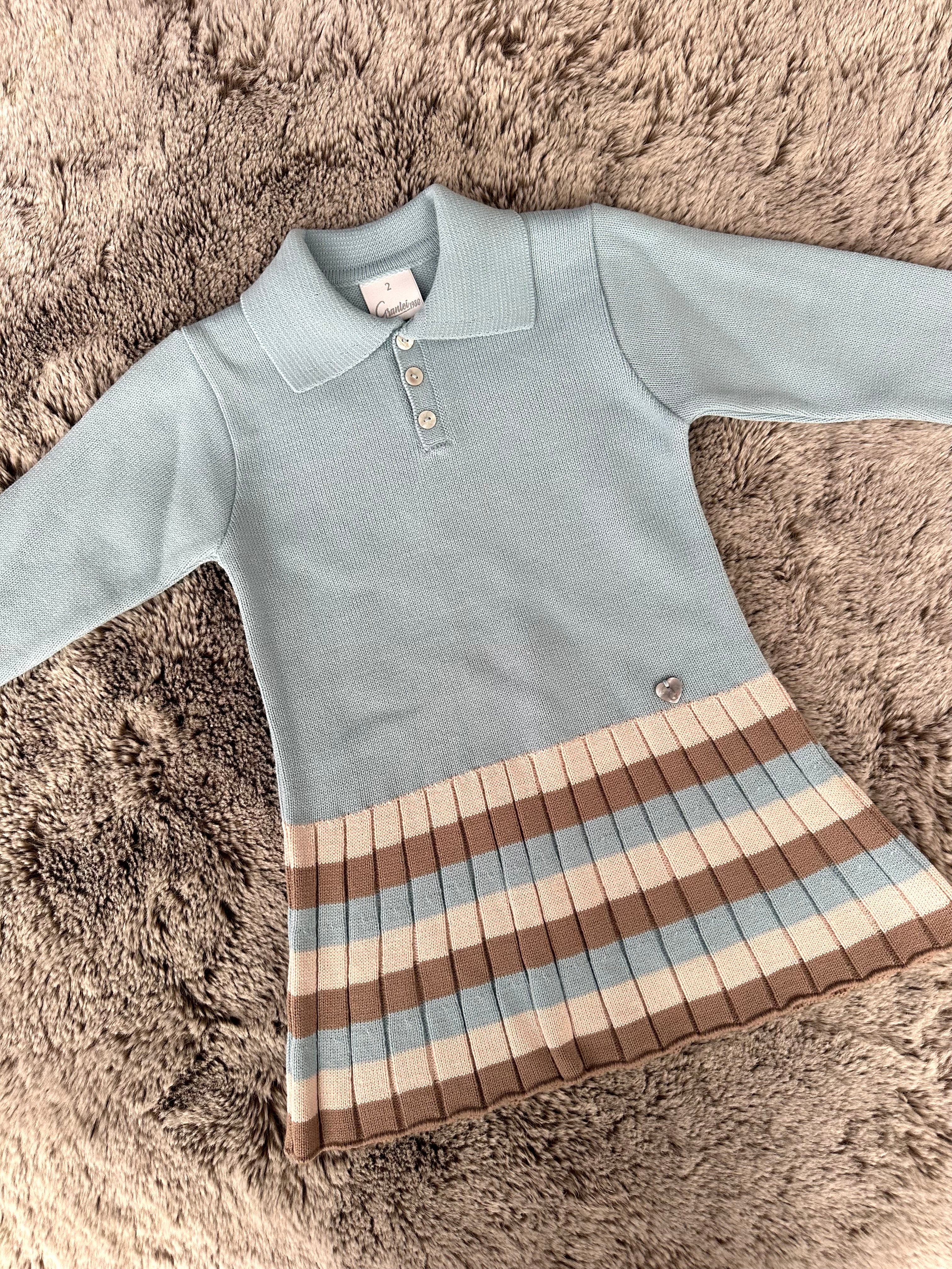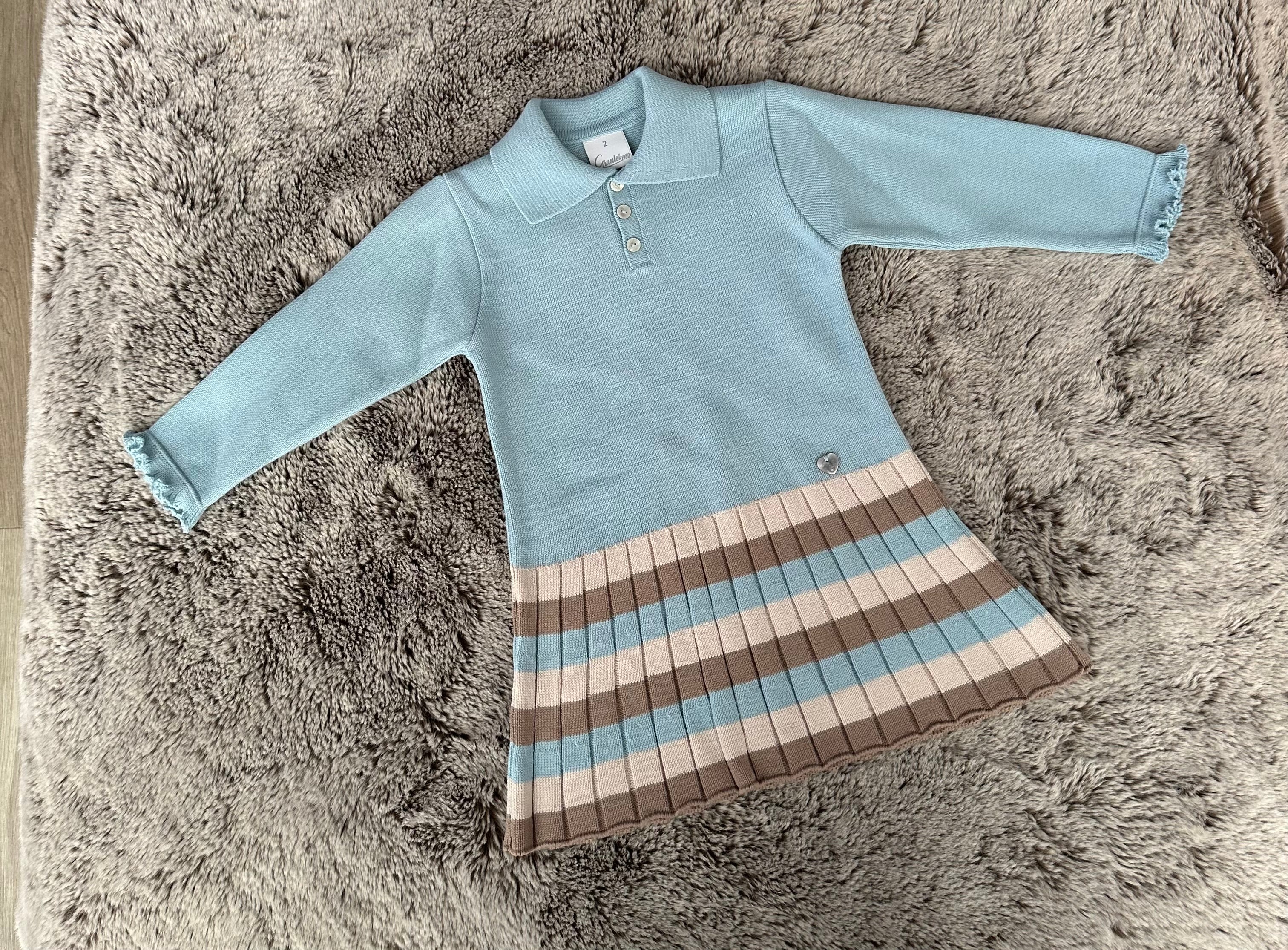 Stunning contemporary knitted dress for girls from Spanish brand Artesania Granlei. Made from a soft feel finely knitted acrylic the dress features a polo style collar, a drop waist pleated skirt is a beige, pale blue and ivory stripe, mother of pearl buttons, a signature Granleicharm and ruffle cuffs.