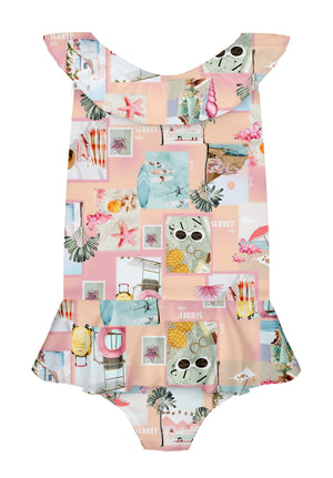 Pretty swimsuit for girls from Jamiks. The swimsuit has an SPF 50+ protective treatment that blocks 98% of the suns rays and comes in a pink fabric overlaid with a sweet multi-colouredpostcard print. Sweet frills to the shoulder and waistband complete the look Fit: True to size (e.g. 12 months = 9-12 months)Composition: 82% polyester, 18% elastane Care: Machine Washable (40 degrees) Brand: Jamiks Made in Poland