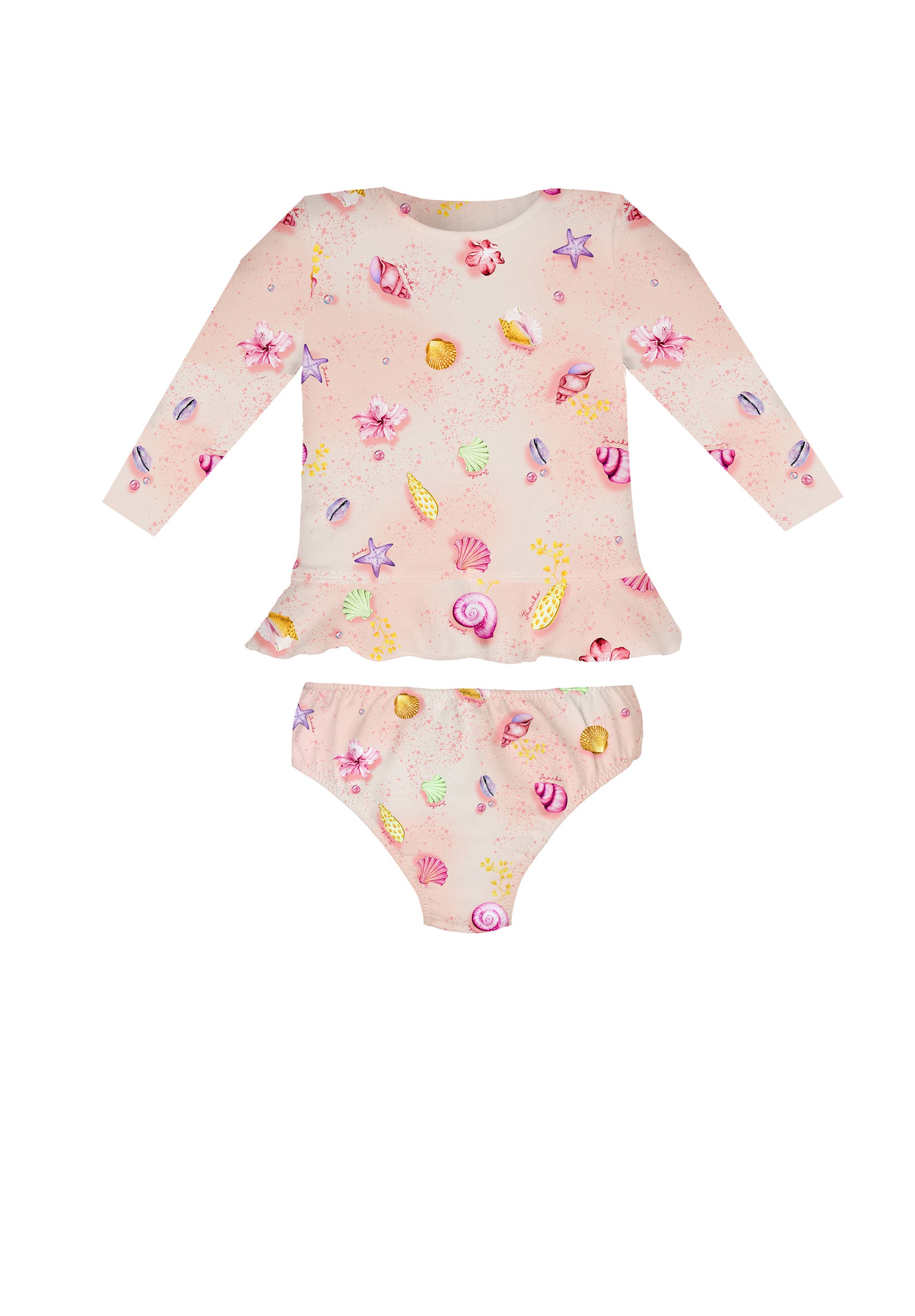 Pretty swimsuit set for younger girls from Jamiks. The set has an SPF 50+ protective treatment that blocks 98% of the suns rays and comes in a pink and ecru colour wash overlaid with a sweet multi-coloured shell print. The top features a frill to the hem.