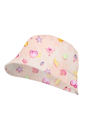 Adorable classic style cotton sunhat from Jamiks. Made from a soft polyester elastane mix the hat is a pink with a sweet shell print all over. Lined for comfort.