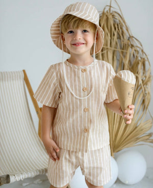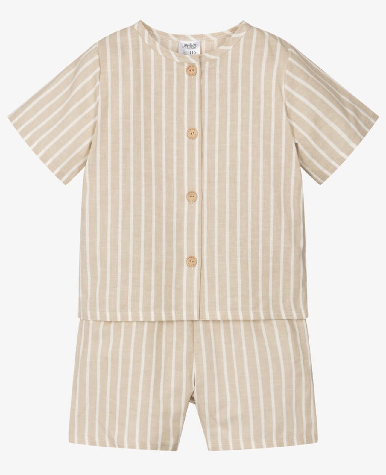 Smart shorts set for boys from Jamiks. Made from a soft linen cotton blend beige and white striped fabric the collarless top fastens to the front with sweet wooden buttons and comes with matching shorts. The shorts have an elasticated waistband for comfort. Fit: True to size (e.g. 12 months = 9-12 months)Composition: 55% linen, 45% cotton Care: Machine Washable (40 degrees) Brand: Jamiks Made in Poland