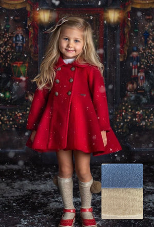 Beautiful classic double-breasted swing cut coat from Spanish Atelier Marae Kids. Handmade in Marae’sSpanish atelier the coat is made from sky blue Austrian boiled merino wool. The coat features stunning heraldic metal buttons, the coat skirt swings out from the waist. The woolen trim to the collar, sleeves, hem and front openings is a white merino wool.
