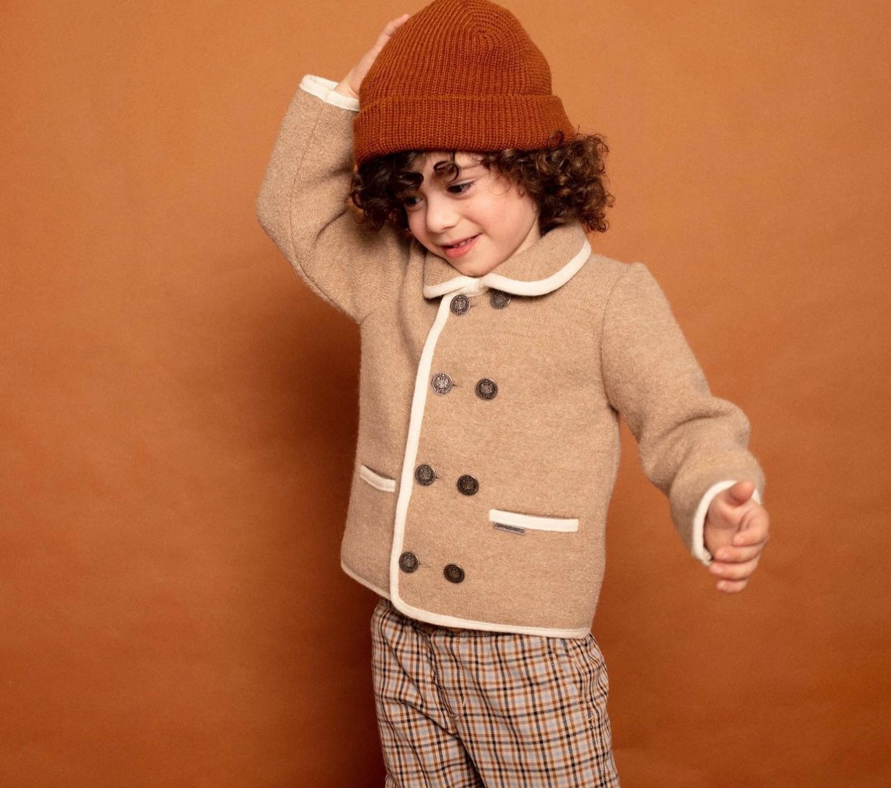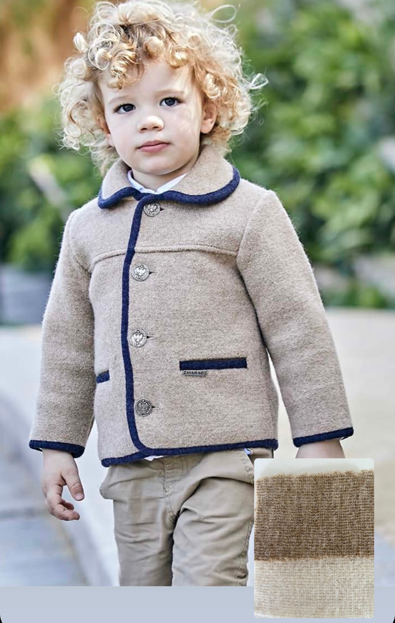 Smart classic jacket from Spanish Atelier Marae Kids.Handmade in Marae’s Spanish atelier the coat is made from camel Austrian boiled merino wool. The jacket features stunning metal heraldic buttons and two cream trimmed pocket flaps to the front. Cream woolen trim to the pockets, collar, sleeves, hem and front openings complete the look.
