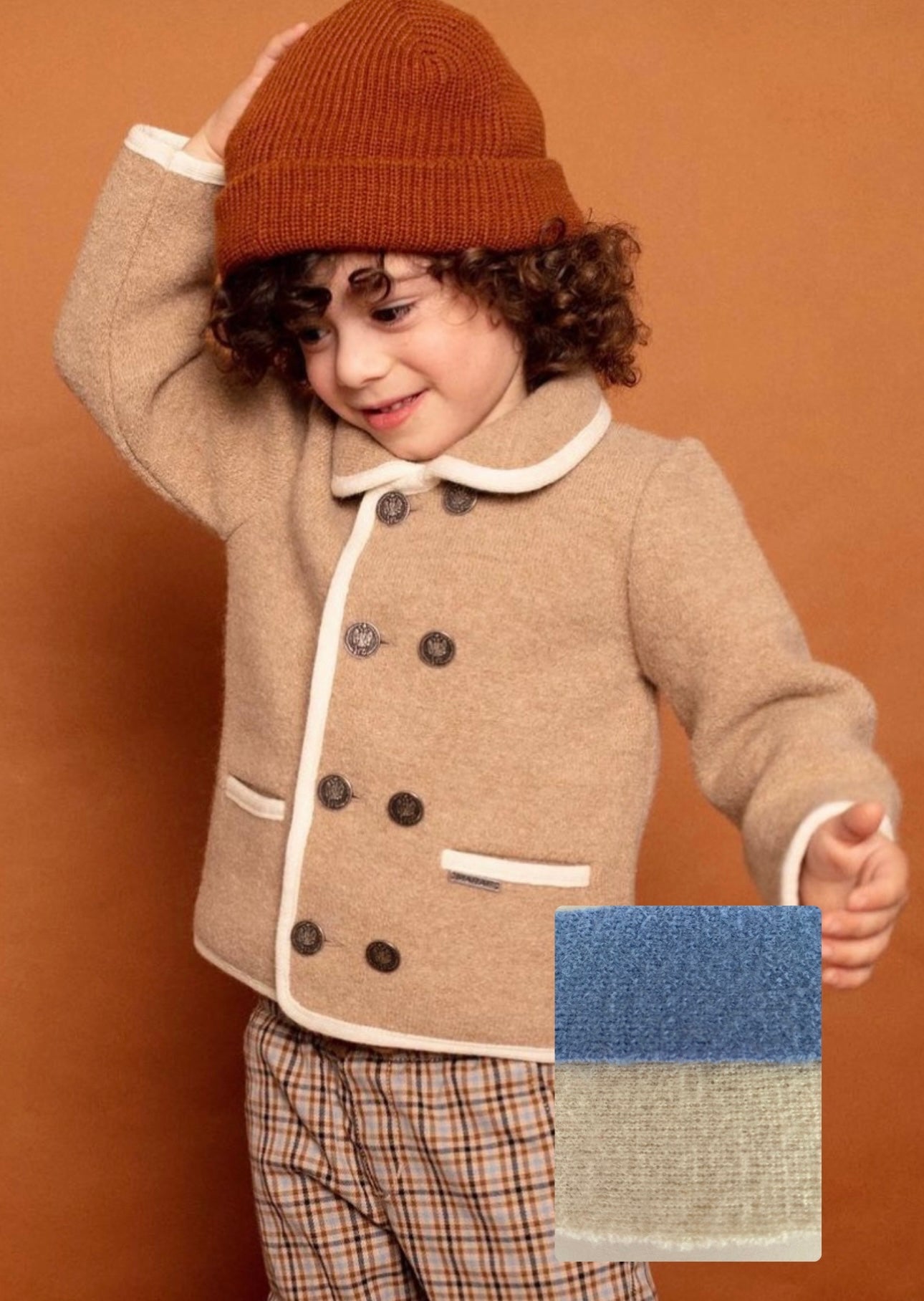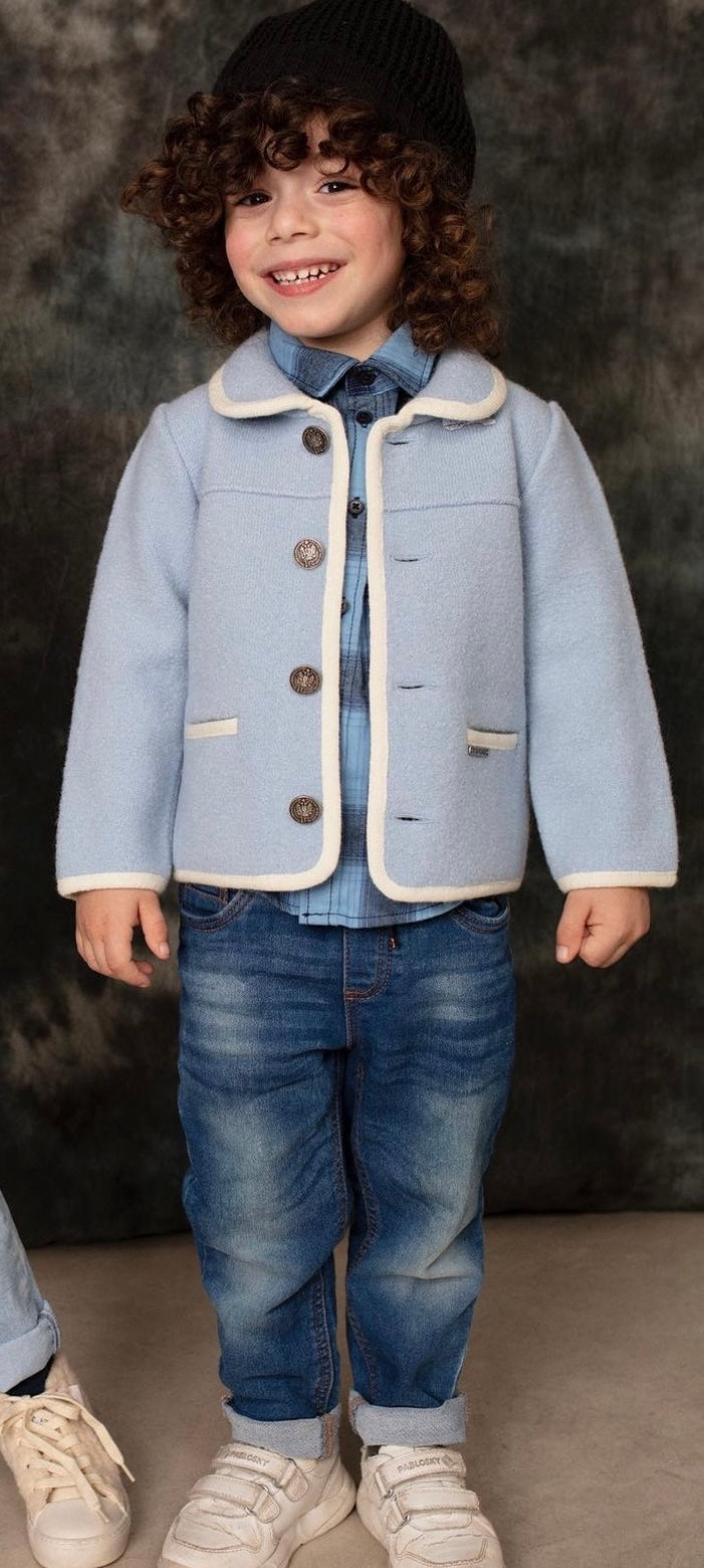 Smart classic jacket from Spanish Atelier Marae Kids.Handmade in Marae’s Spanish atelier the coat is made from sky blue Austrian boiled merino wool. The double breasted jacket features stunning metal heraldic buttons and two white trimmed pocket flaps to the front. Whitewoolen trim to the pockets, collar, sleeves, hem and front openings complete the look.