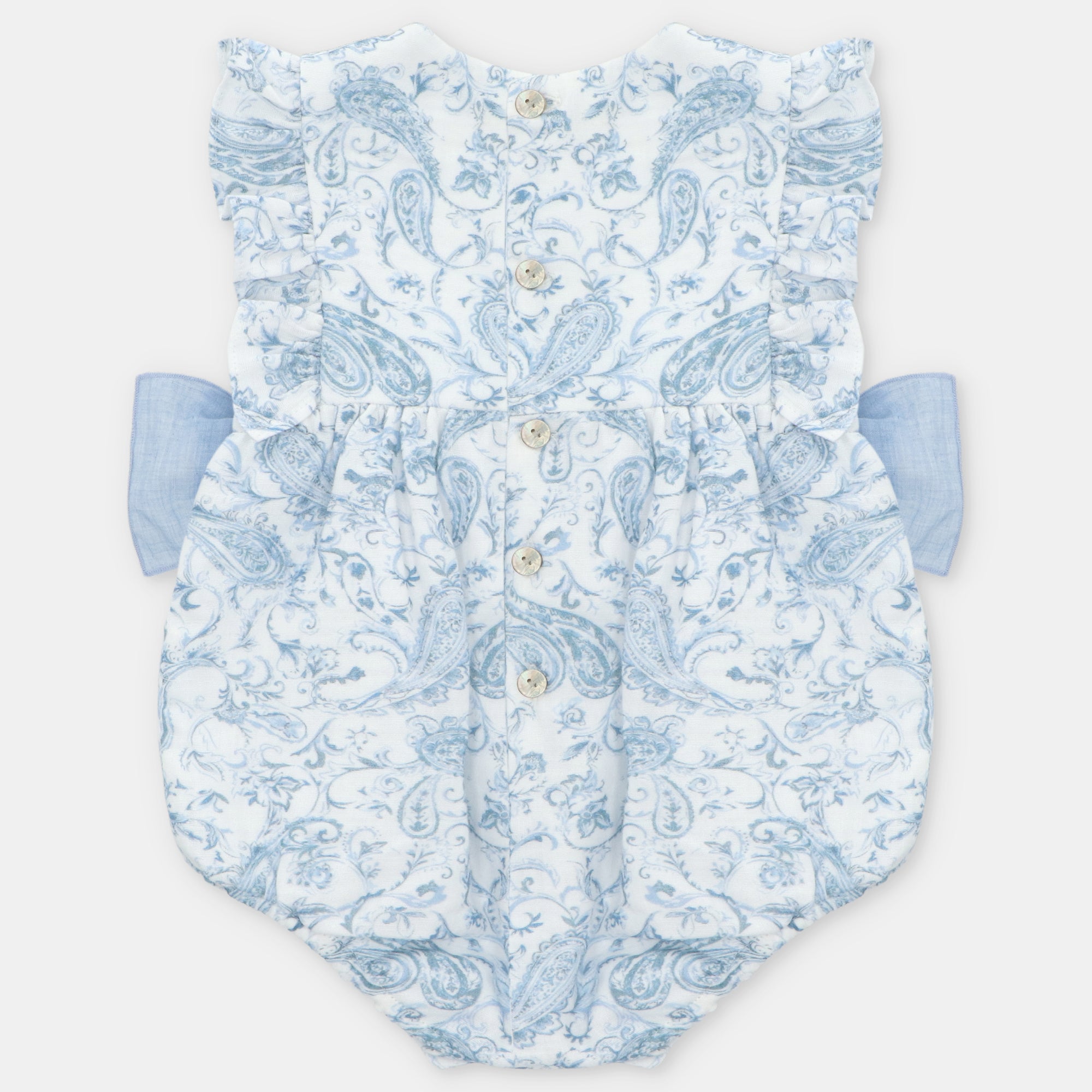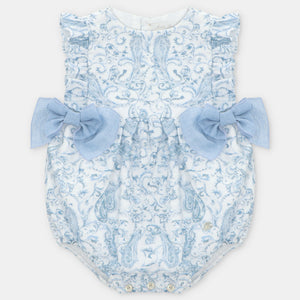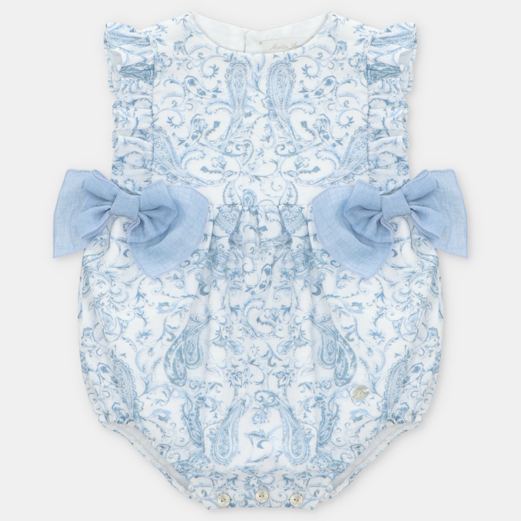 Beautiful romper for baby girls from Spanish brand Martin Aranda. Made from a medium-weight white and blue paisley print cotton this stunning romper features a gorgeous frill to the bodice back and front and two large double bows in a blue linen mix to the front, a Martin Aranda charm completes the look. Fully lined in a soft white cotton the romper fastens at the back and between the legs with sweet grey mother of pearl buttons. Fit: True to size (e.g. 12 months = 9-12 months)Composition: 100% cotton Care: Machine Washable (30 degrees) Brand: Martin Aranda