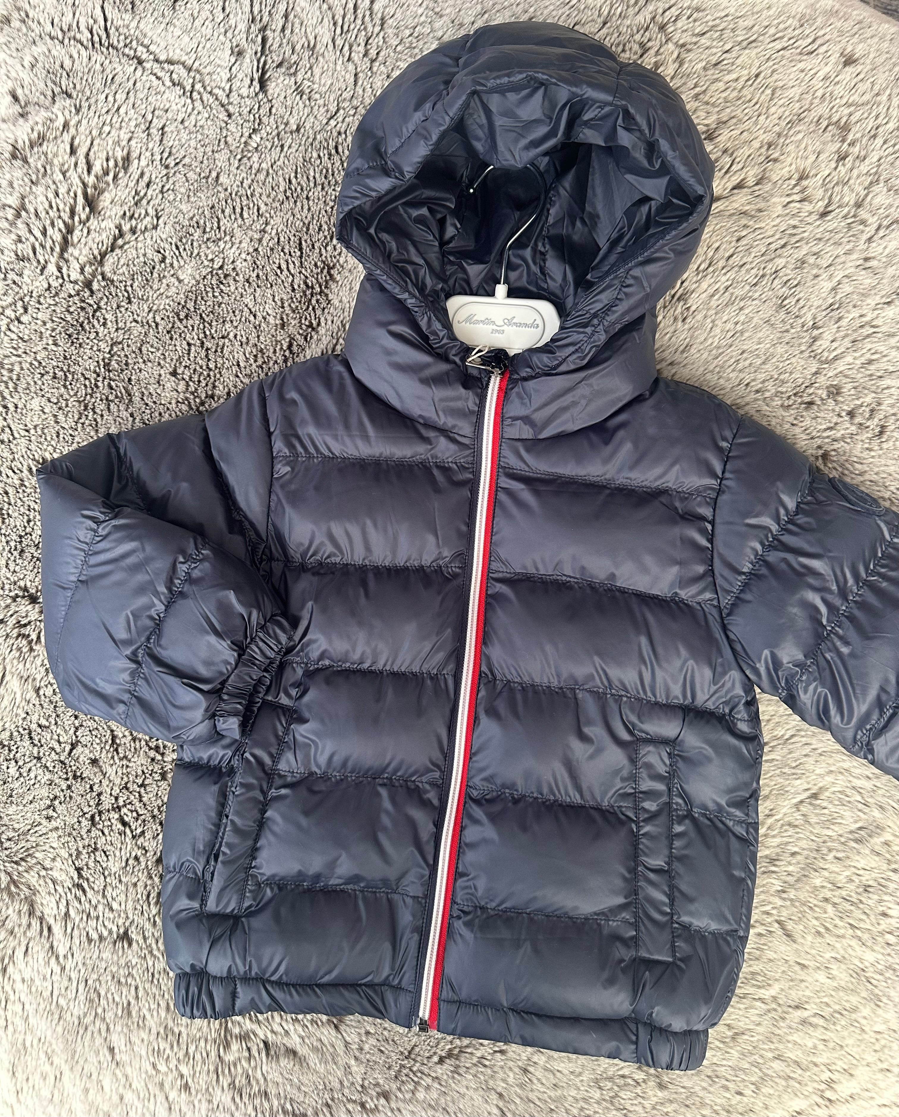 Smart puffer jacket for boys from Spanish brand Martin Aranda. Made from a silky feel soft polyester the jacket is waterproof and windproof. Lined with polyester padding it provides a lightweight but warm garment ideal for winter. The jacket is hooded, has popper fasteningpockets to the side and features a statement red, silver and navy striped zip fastening. Jacket and hood are lined in navy polyester to match the outer jacket.