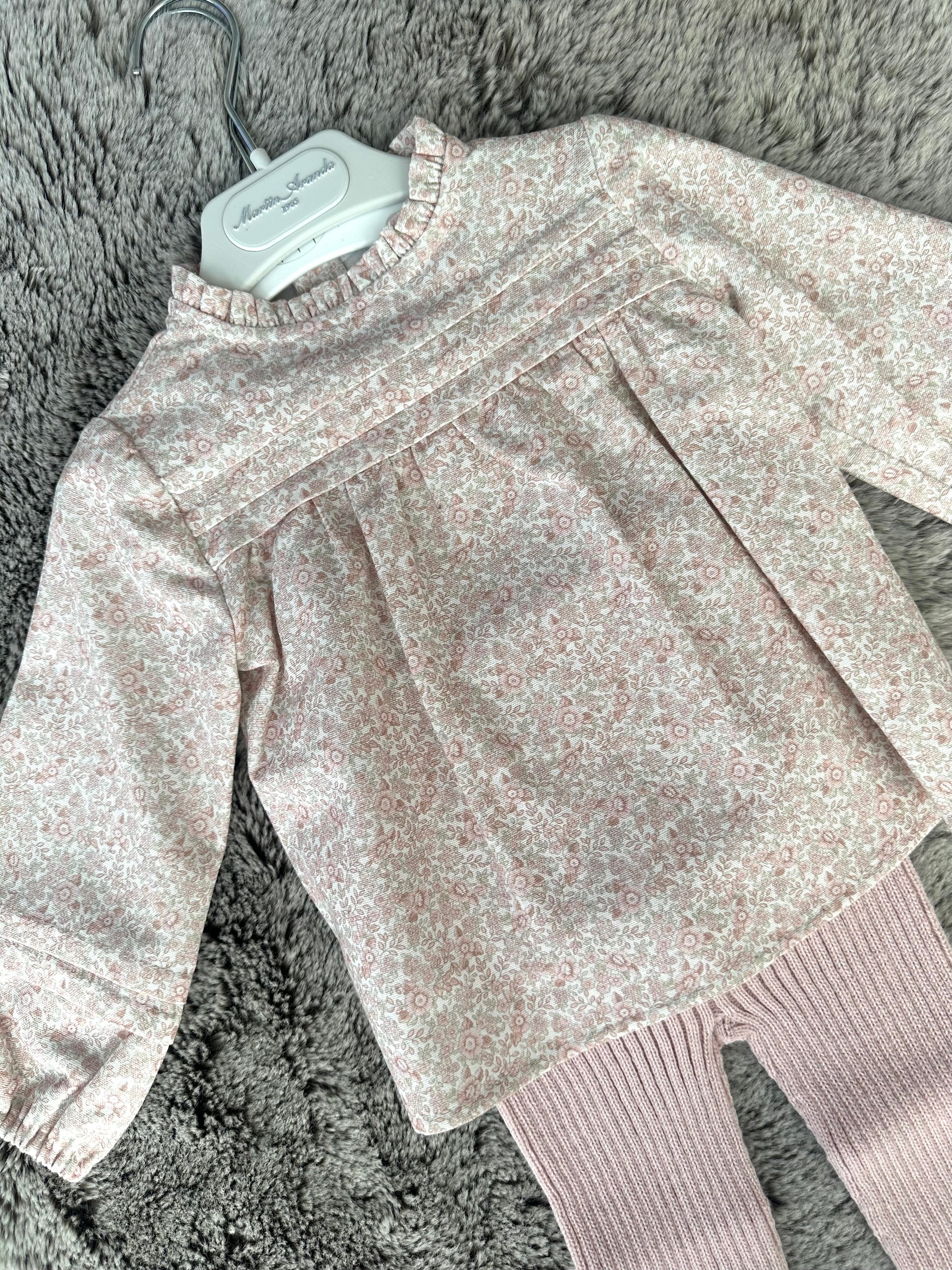 Stunning legging set for girls from Spanish brand Martin Aranda. The soft feel pink cotton ditsy print blouse has a soft brushed cotton inner for warmth, pretty pleating to the bodice and the sleeves and a pleated collar add sweet detailing, a signature Martin Aranda mother of pearl charm completes the look. Comes with dusky pink ribbed knitted leggings, the leggings feature turn-up leg cuffs trimmed with a mother of pearl button.