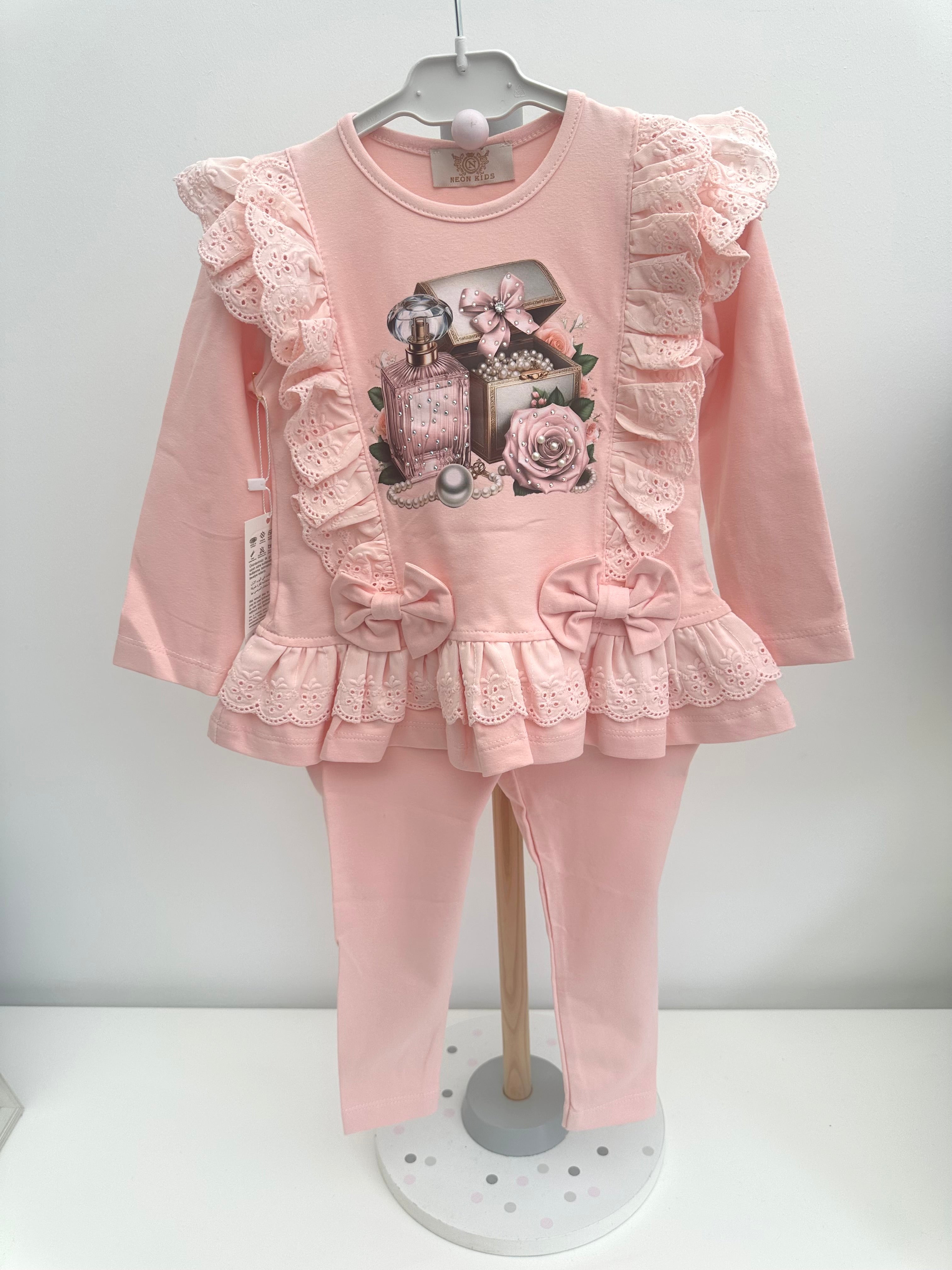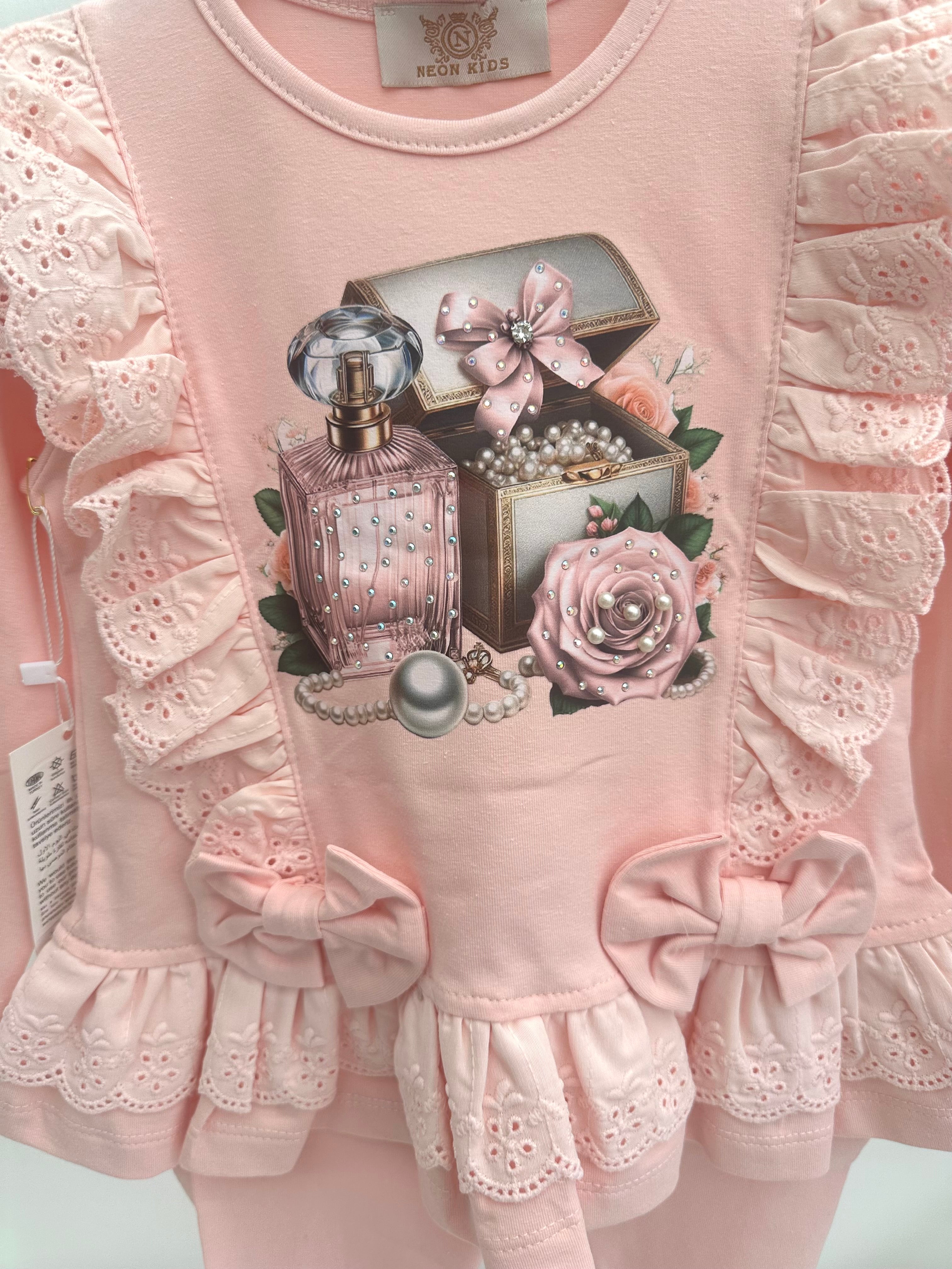 Pretty legging set from British brand Neon Kids. Made from a soft feel medium weight peach cotton jersey the top features a perfume bottle, rose and jewellery box motif trimmed with diamonte and pearls. Sweet embroidery anglaise frills and bows to the front complete the look. The leggings have an elasticated waistband . 95% cotton, 5% elastane Machine wash 30*C 2-piece set Made in Turkey. Fit: True to size (e.g. 12 months = 9-12 months) Care: Machine Washable (30 degrees)
