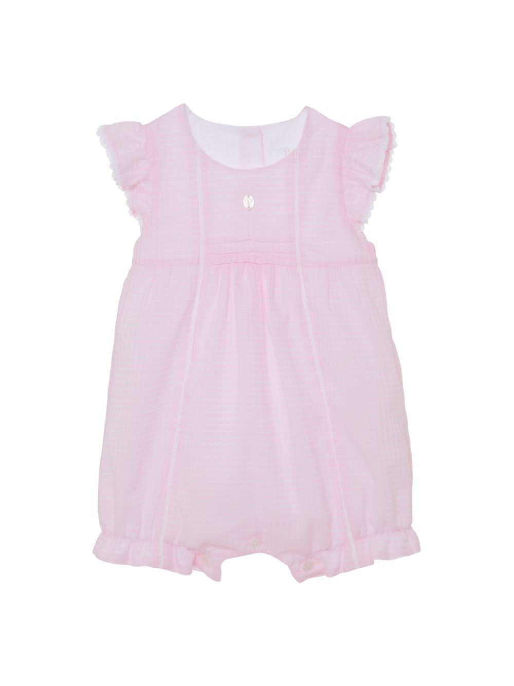 Pretty romper for baby girls from Portuguese brand Patachou. Made from a soft feel pink square print cotton fabric. The romper features two white cotton cutwork stripes to the front, beautiful pleated ruffle sleeves trimmed with a delicate white lace, pintucks to the bodice and a signature Patachou charm. Fully lined this delightful romper fastens between the legs and at the back with pretty white pearlised buttons.
