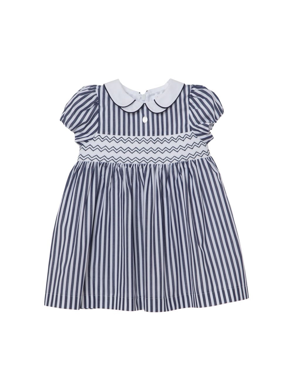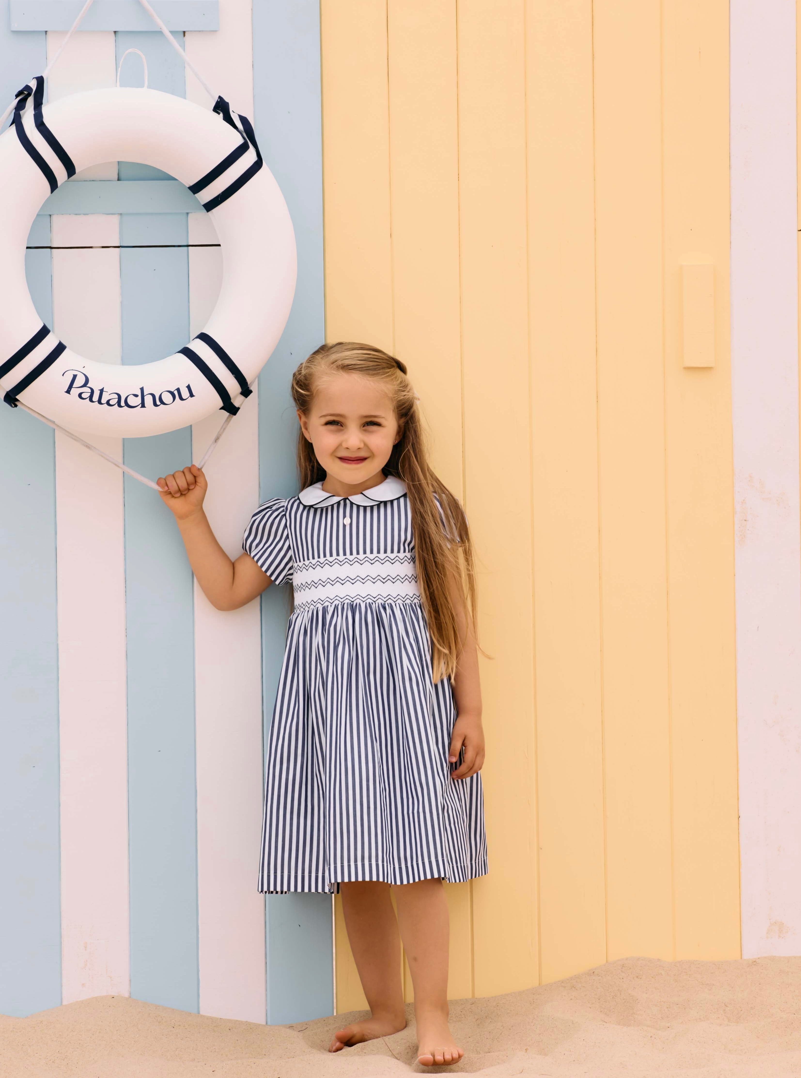 A stunning summer dress from Portuguese brand Patachou. Made from a navy and white striped cotton this classic styled dress features pretty full puff sleeves, a sweet white cotton double tiered collar edged with navy piping and a gorgeous deep white smocked panel embroidered with a navy geometric pattern. A signature Patachoucharm to the bodice completes the look. Dress is fully lined for comfort and fastens at the back with a concealed zip. Fit: True to size (e.g. 12 months = 9-12 months)Composition: 100% cotton Care: Machine Washable (30 degrees) Brand: Patachou
