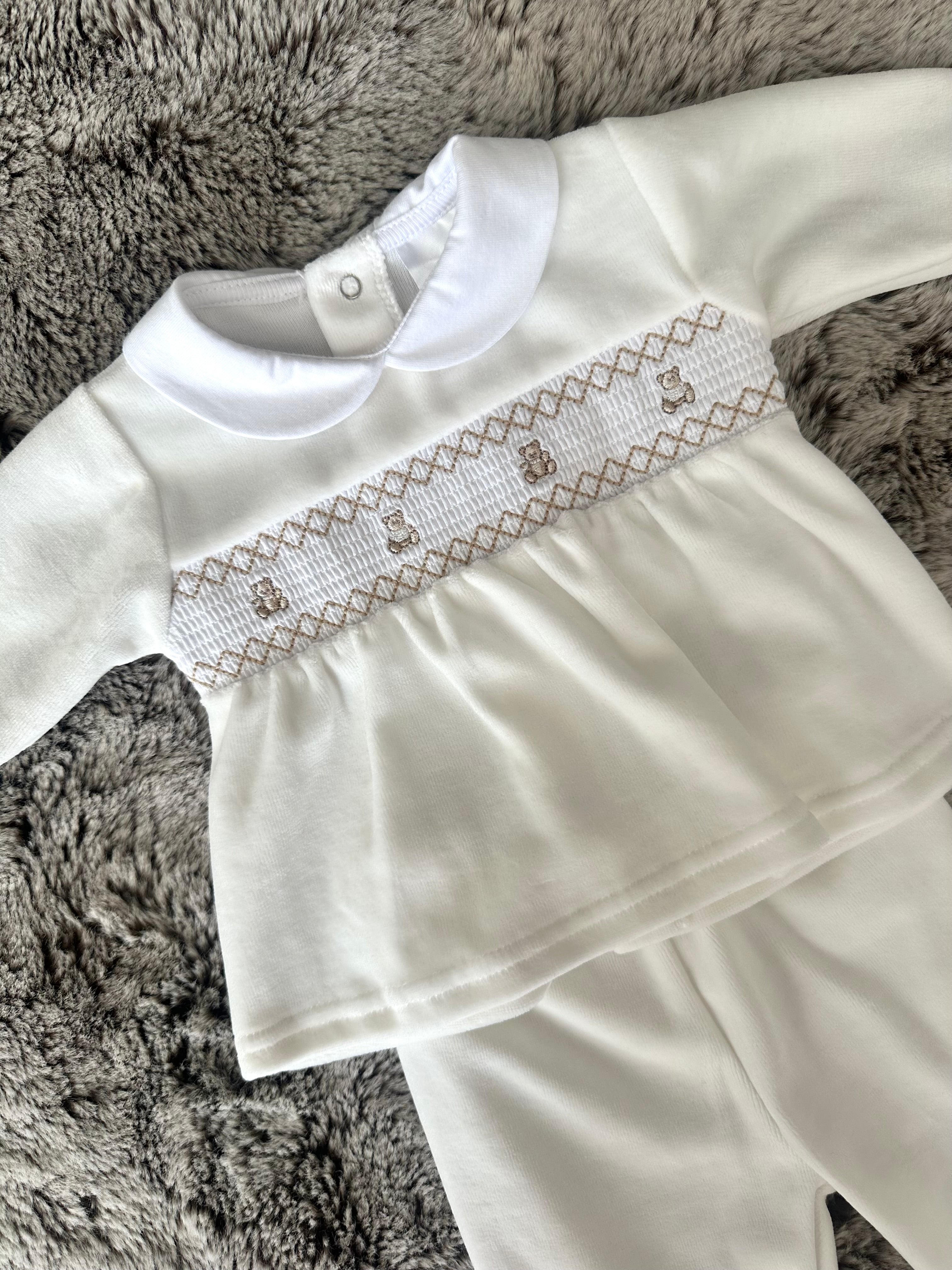 Pex Pearl Velour Smocked Teddy Bear 2-Piece Babygrow