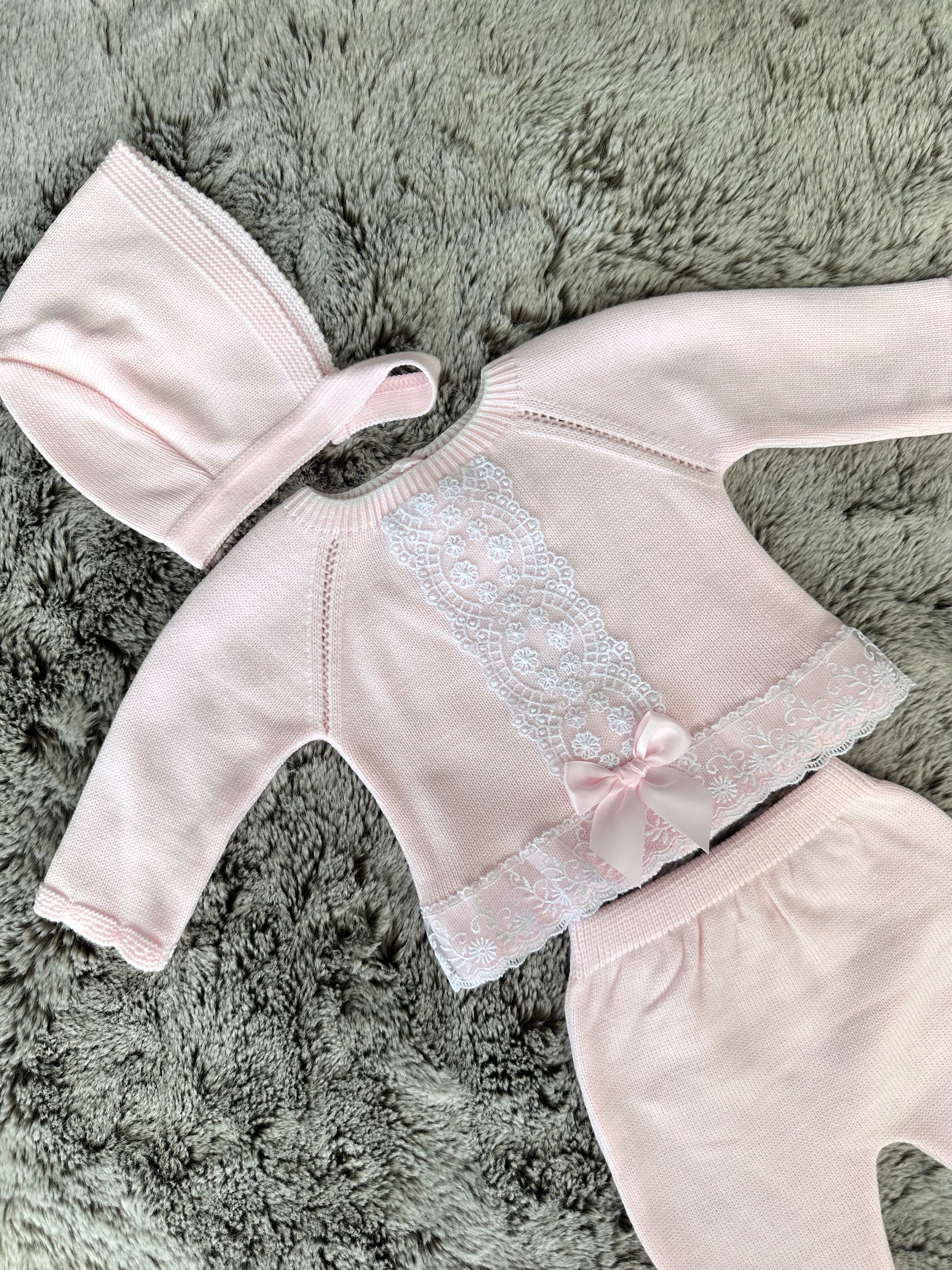 Gorgeous set for baby girls from British brand Pex. Made in a soft feel pale pink acrylic knit the top features a pretty white lace trim to the front and hem, a pink satin bow completes the look. Comes with matching footed leggings with a gently elasticated waistband and a sweet pink bonnet. Top fastens at the back with white pearlisedbuttons.