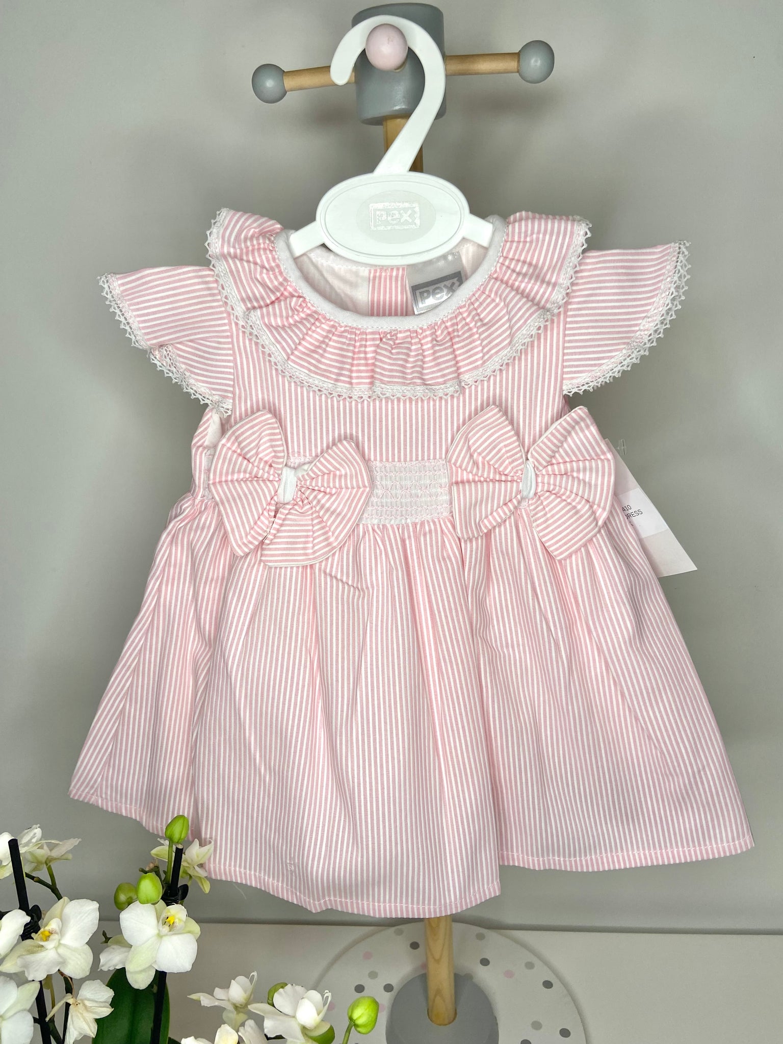 Pretty dress from British brand Pex. Made from a medium weight pink cotton with white pinstripes the dress features a sweet smocked panel to the bodice, a lace trimmed ruffle collar, lace trimmed flutter sleeves and two large bows to the front. The dress button fastens at the back and is fully lined. Fit: True to size (e.g. 12 months = 9-12 months)Composition: 100% cotton Care: Machine Washable (30 degrees) Brand: Pex