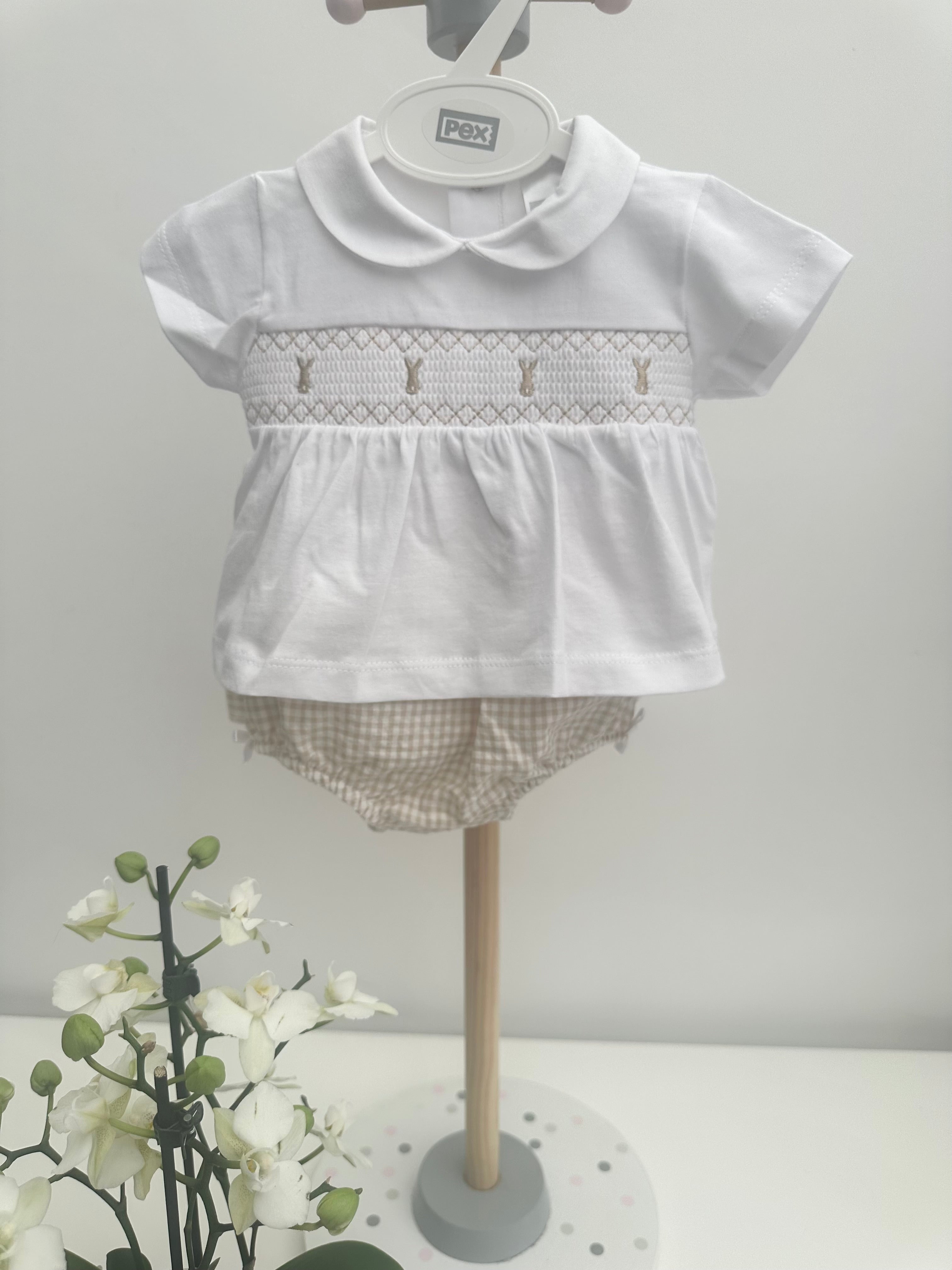Pretty set for baby girls from British brand Pex. The soft white cotton top has a sweet collar and a smocked panel to the bodice embroidered with cute beige bunnies. Comes with beige and white gingham seersucker jam pants with an elasticated waistband and pretty white satin bows to the leg cuffs. Top popper fastens at the back. Fit: True to size (e.g. 12 months = 9-12 months)Composition: 100% cotton Care: Machine Washable (30 degrees) Brand: Pex