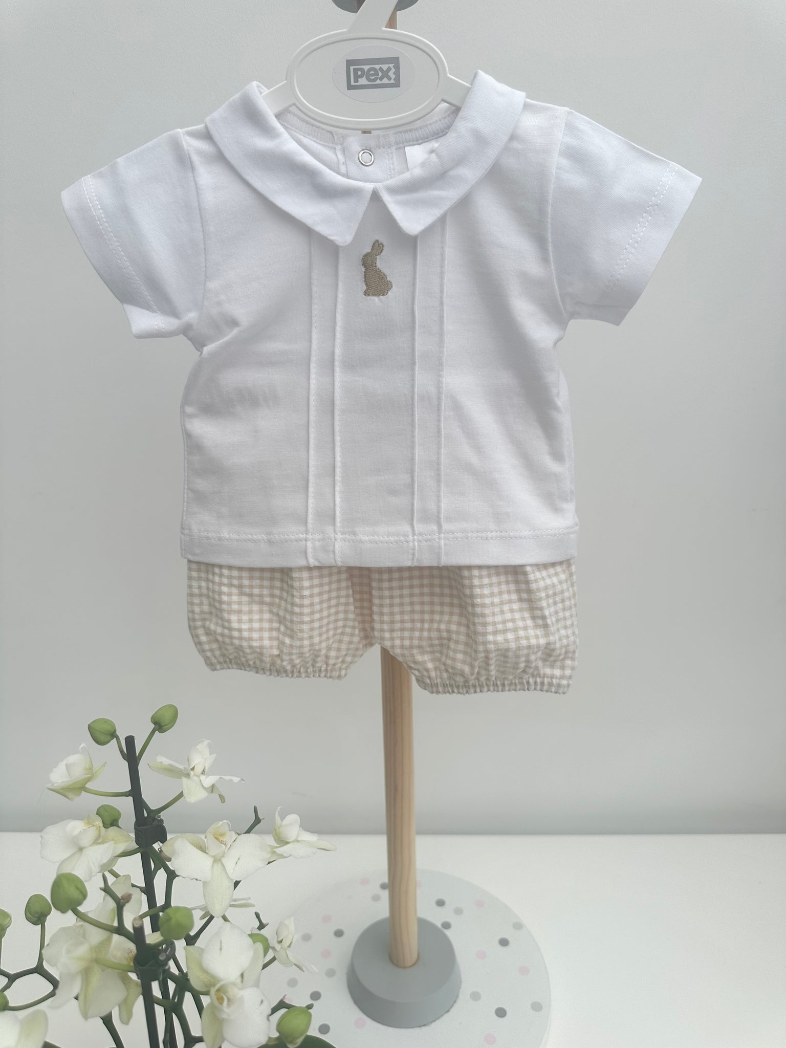 Adorable set for baby boys from British brand Pex. The soft white cotton top has a sweet collar, pin tuck pleats to the front and a cute embroidered beige bunny motif to the chest. Comes with beige and white gingham seersucker shorts with an elasticated waistband and leg cuffs. Top popper fastens at the back. Fit: True to size (e.g. 12 months = 9-12 months)Composition: 100% cotton Care: Machine Washable (30 degrees) Brand: Pex