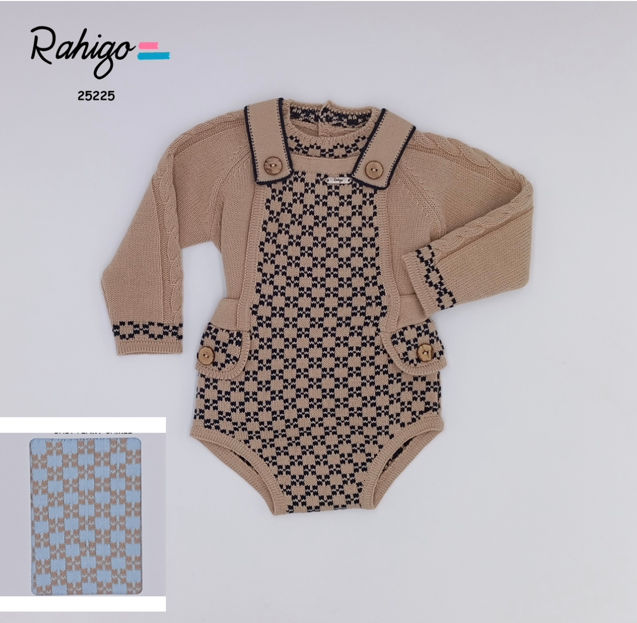 Adorable romper set for baby boys from Spanish brand Rahigo. Made from a soft feel acrylic knit the baby blue sweater features cable knit detailing, the baby blue and camel check romper has button fastenings to the shoulders and little faux pockets to the hips.