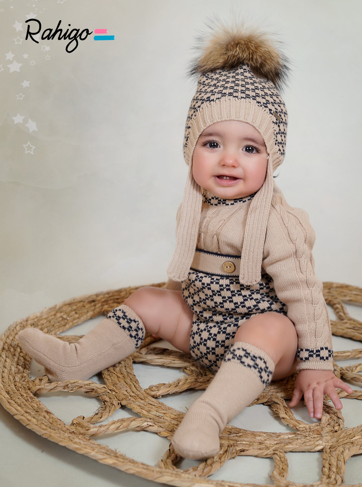 LAdorable romper for baby boys from Spanish brand Rahigo. Made from a soft feel acrylic knit the romper features a camel upper half which features cable knit detailing and a navy and camel check lower half, a sweet button fastening belt to the waist completes the look.