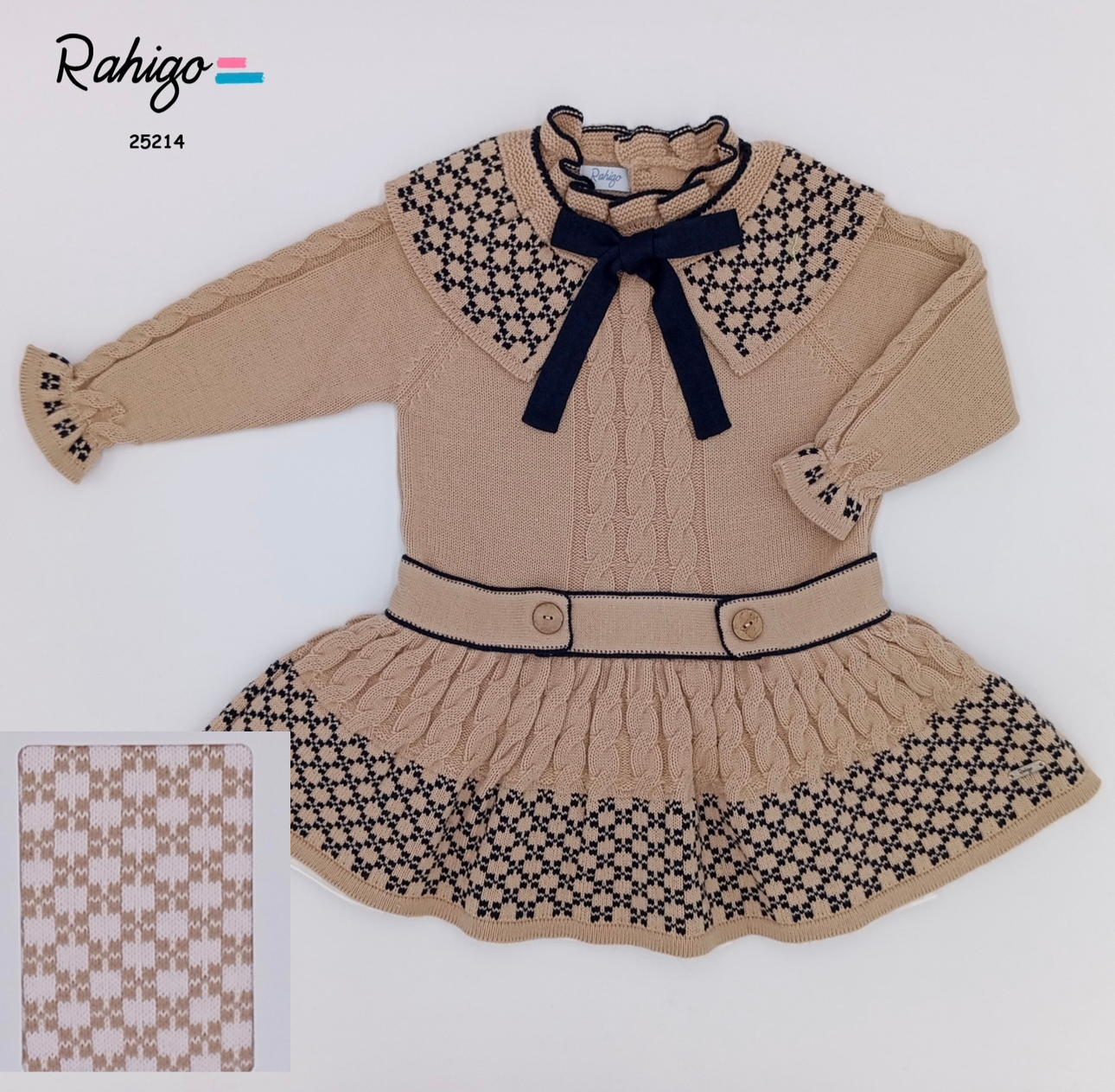 Stunning pale pink and camel dress from Spanish brand Rahigo. Made in a soft feel acrylic knit the pale pink dress features a large pale pink and camel check collar and skirt, pretty cabling detailing and a sweet button belt to the hips and a large bow to the collar complete the look.