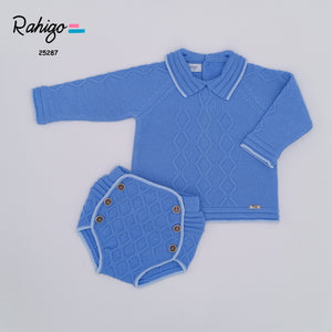 Adorable set for boys from Spanish brand Rahigo. Made from a sky blue soft feel acrylic knit the sweater features a diamond pattern to the knit, white edging to the collar, hem and cuffs add sweet detailing, the matching jam pants features metal buttons to the front and white edging to the seams.