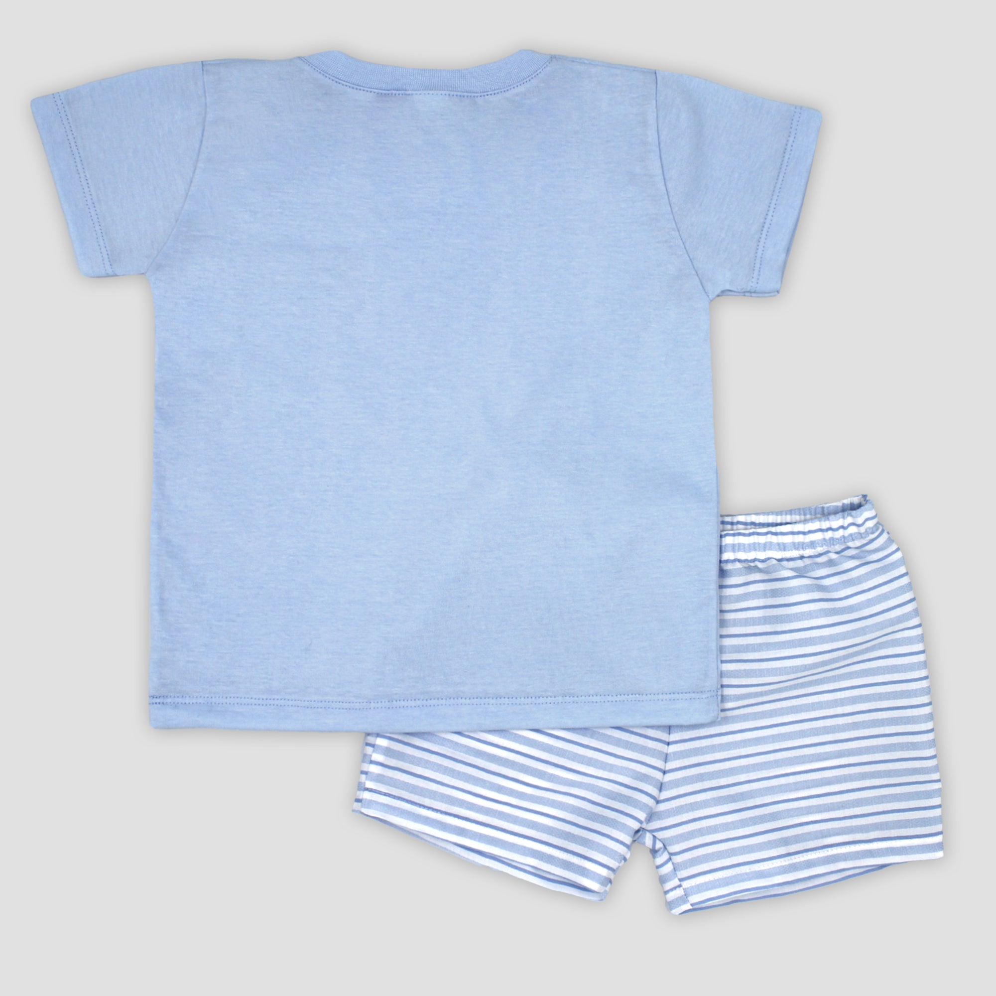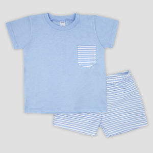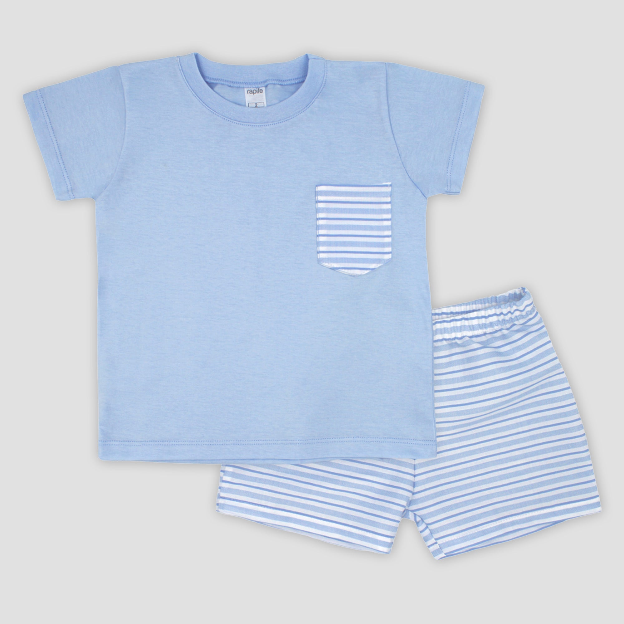 Classic summer short set from Spanish brand Rapife. The top is a soft feel blue cotton with a feature blue and white horizontal striped patch pocket to the chest to match the shorts. Shorts have an elasticated waistband. Fit: True to size (e.g. 12 months = 9-12 months)Composition: 100% cotton Care: Machine Washable (30 degrees) Brand: Rapife