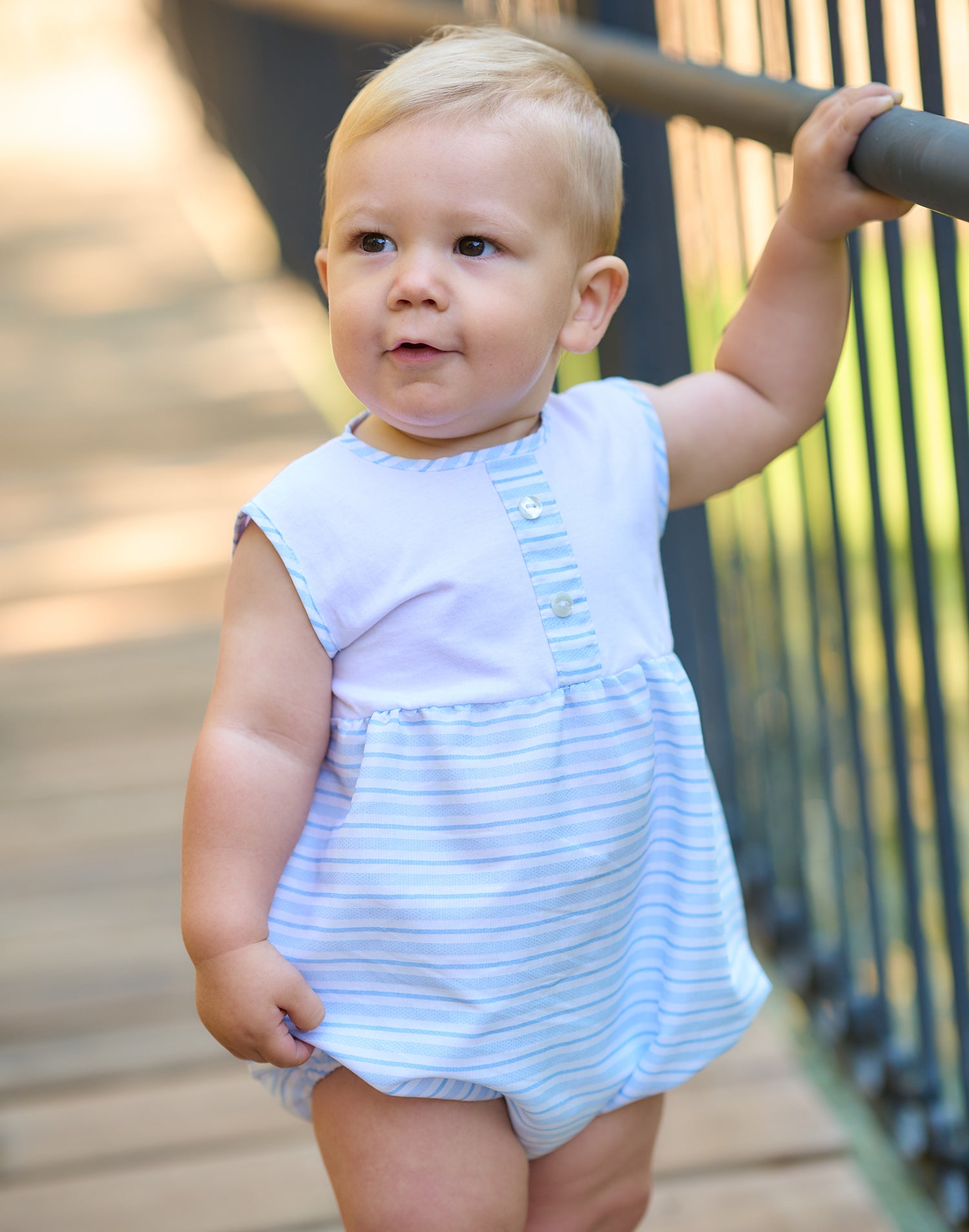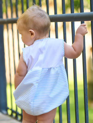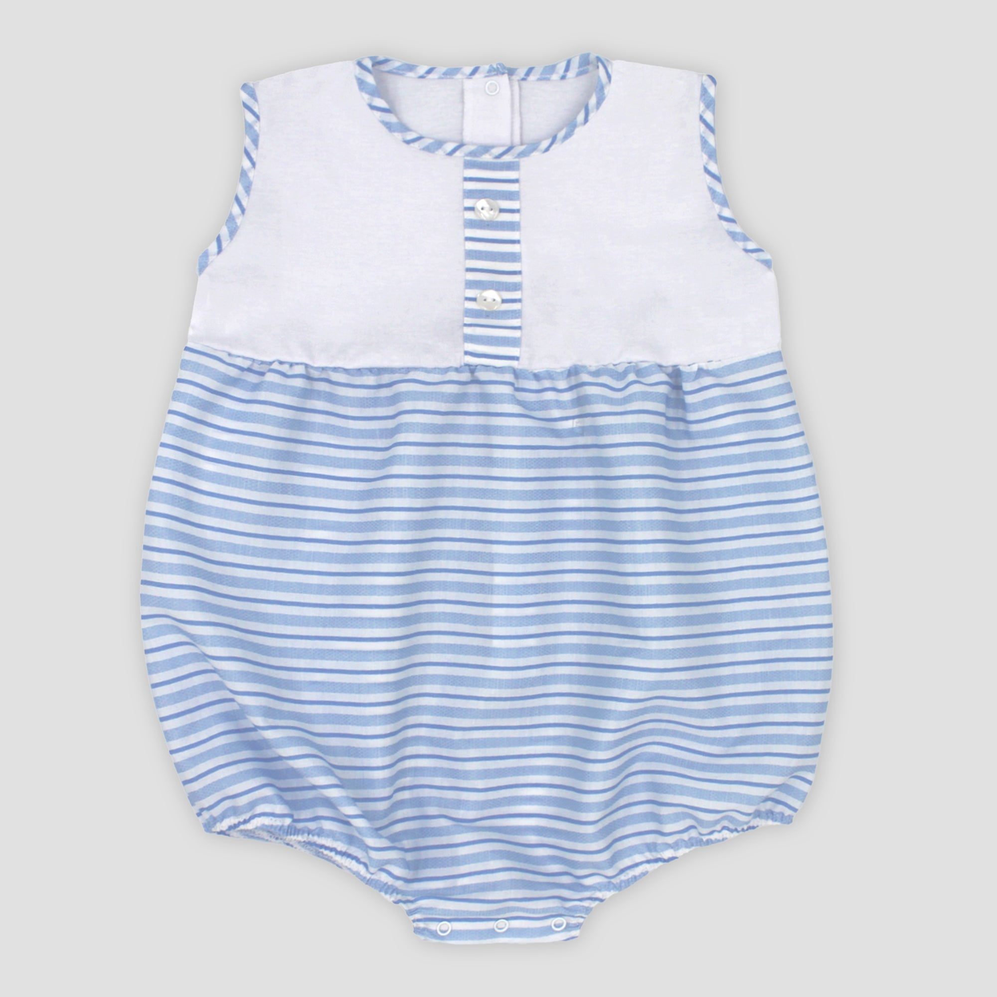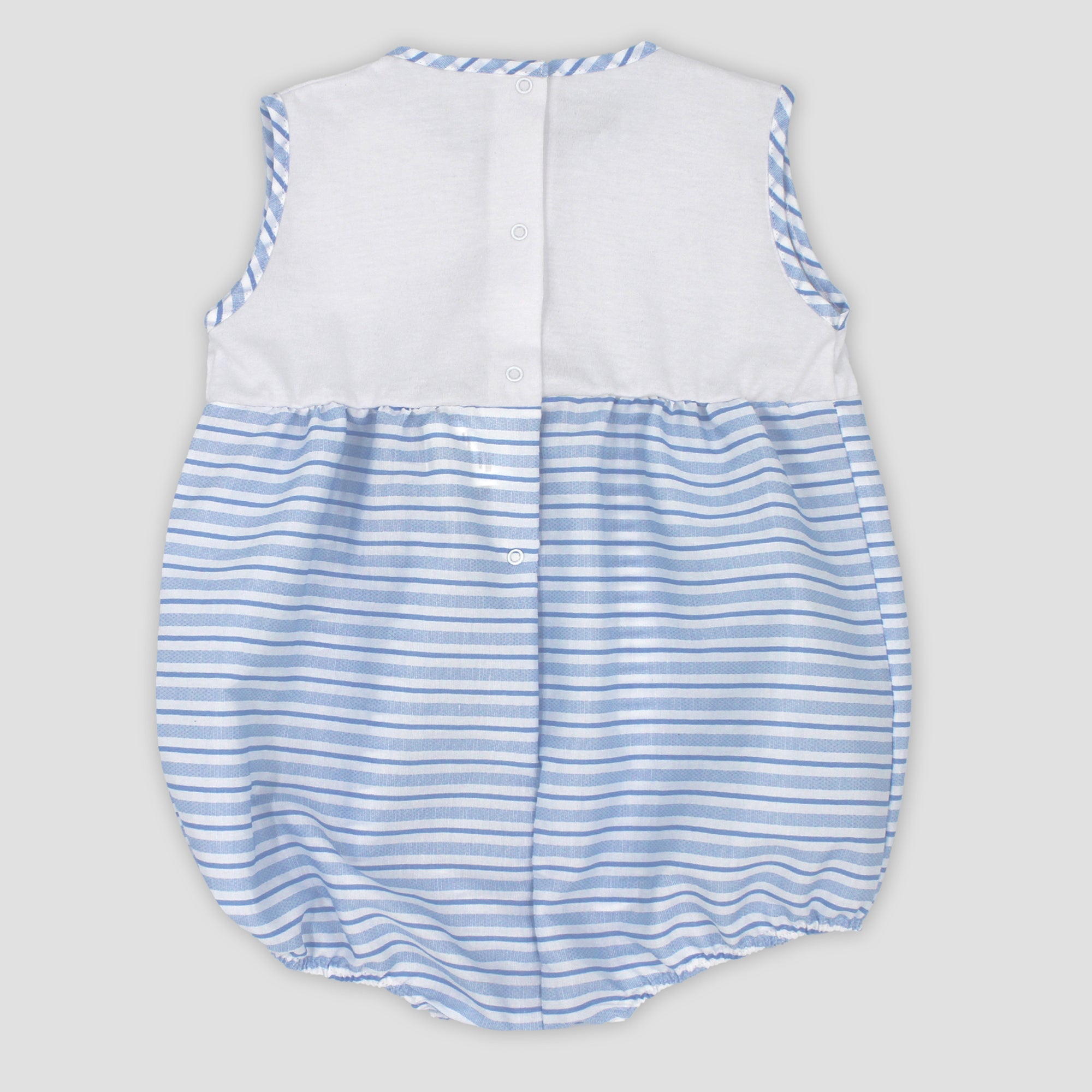 Sweet romper for younger boys from Spanish brand Rapife. The top half is a soft white cotton, the lower half features sky blue and white stripes, matching stripe edging to the neckline and arm holes and a button trimmed stripe to the bodice complete the look. Popper fastens at the back and between the legs Fit: True to size (e.g. 12 months = 9-12 months)Composition: 100% cotton Care: Machine Washable (30 degrees) Brand: Rapife