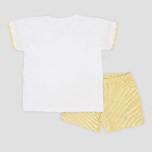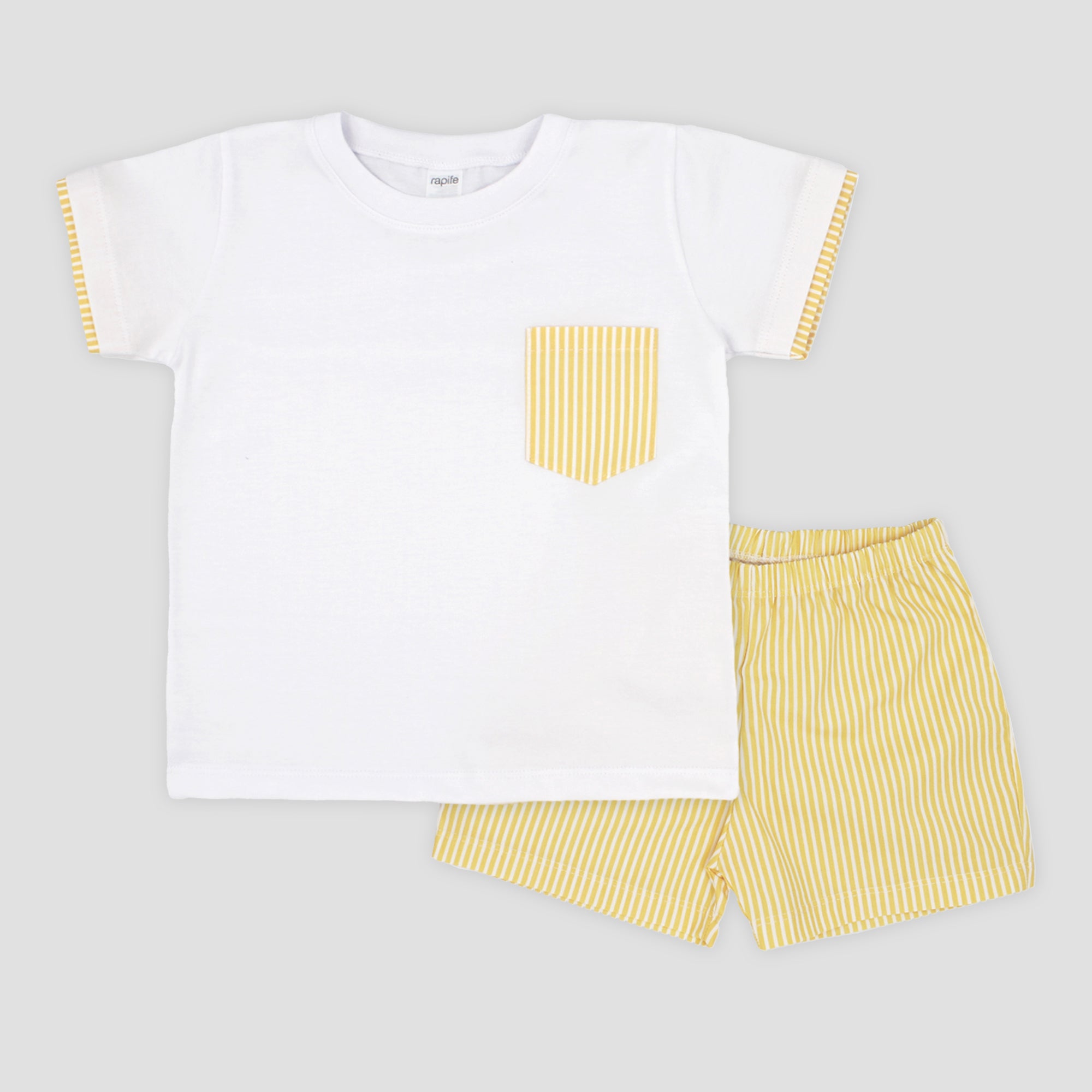 Classic summer short set from Spanish brand Rapife. The top is a soft feel white cotton with a feature yellow and white vertical striped patch pocket to the chest and trims to the sleeves to match the shorts. Shorts have an elasticated waistband. Fit: True to size (e.g. 12 months = 9-12 months)Composition: 100% cotton Care: Machine Washable (30 degrees) Brand: Rapife